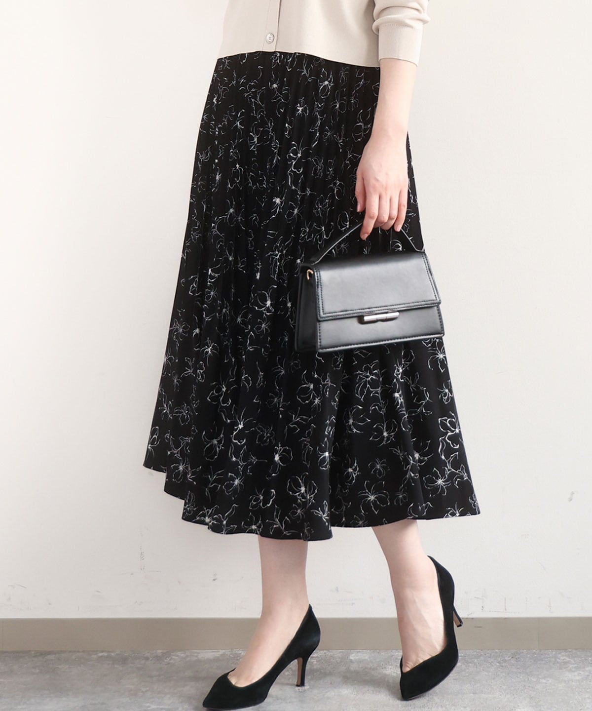 華やかでエレガントなラインフラワーのプリントはやわらかな線画の花柄がレディライクな印象を演出し、ウエストは総ゴム仕様ながらフロントにベルト風デザインを施し、トップスをインした際も美しいシルエットをキープします。