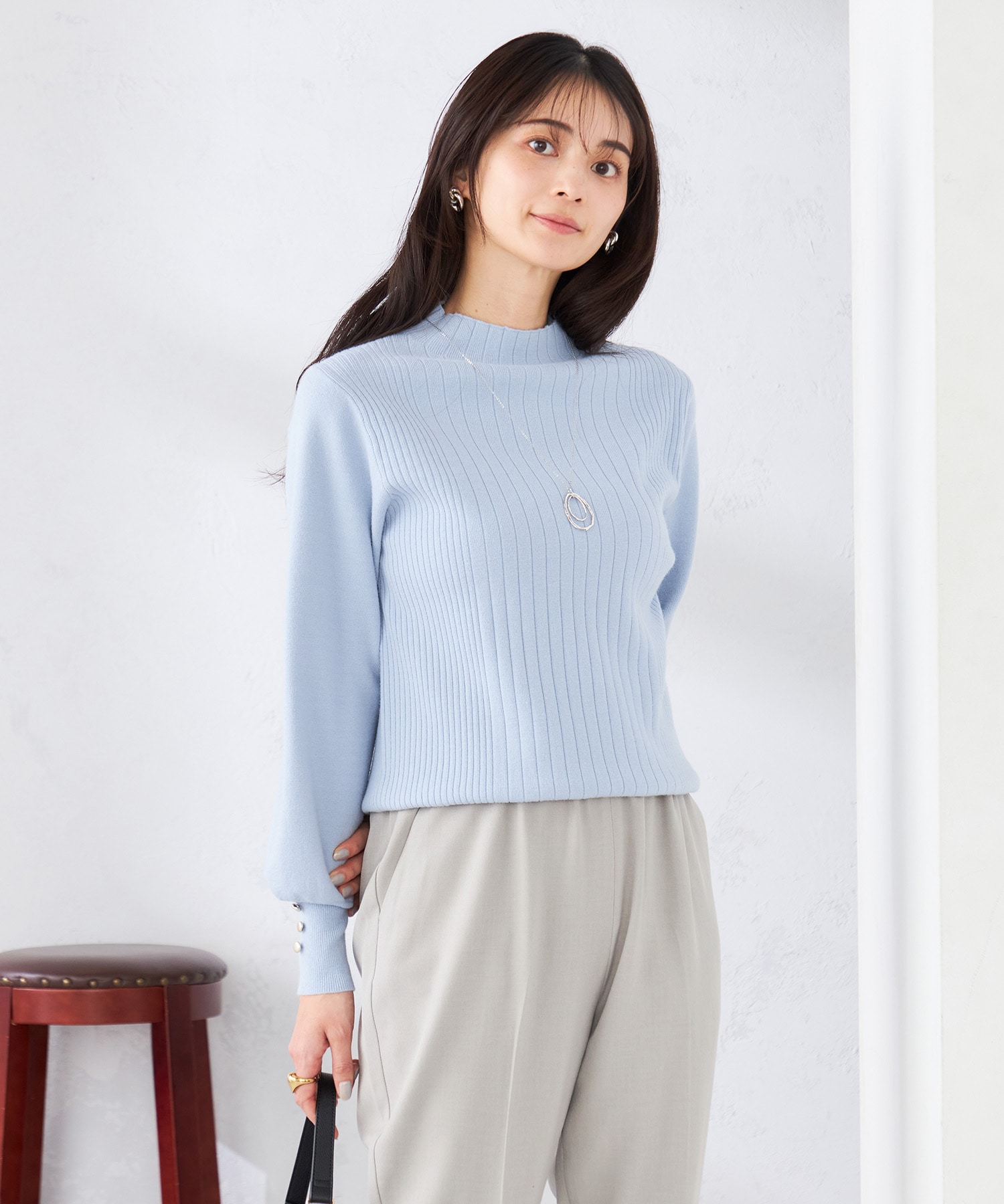 ニットはシンプルながらも総針編みの凹凸感と袖のボタンがポイントで着こなしに華やかさをプラスします◎