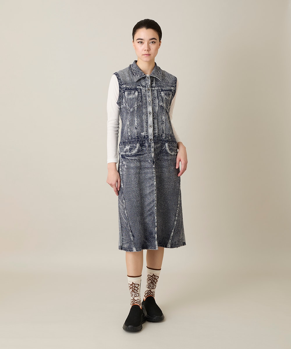 デニムをプリモーディアルで表現した注目の新アイテムです。とても軽量でストレッチが効いているので着心地抜群です。デニムの様に見えますが、データを読み込み編みたて、製品染めすることにより、色の濃淡や素材感を表現した価値ある一枚です。春はインに長袖カットソー、夏は一枚で着用できるのでロングシーズンで活躍します。小さめの衿が目線を上にあげすっきりとした印象に見せます。ぜひ手に取ってご覧いただきたい一枚です。