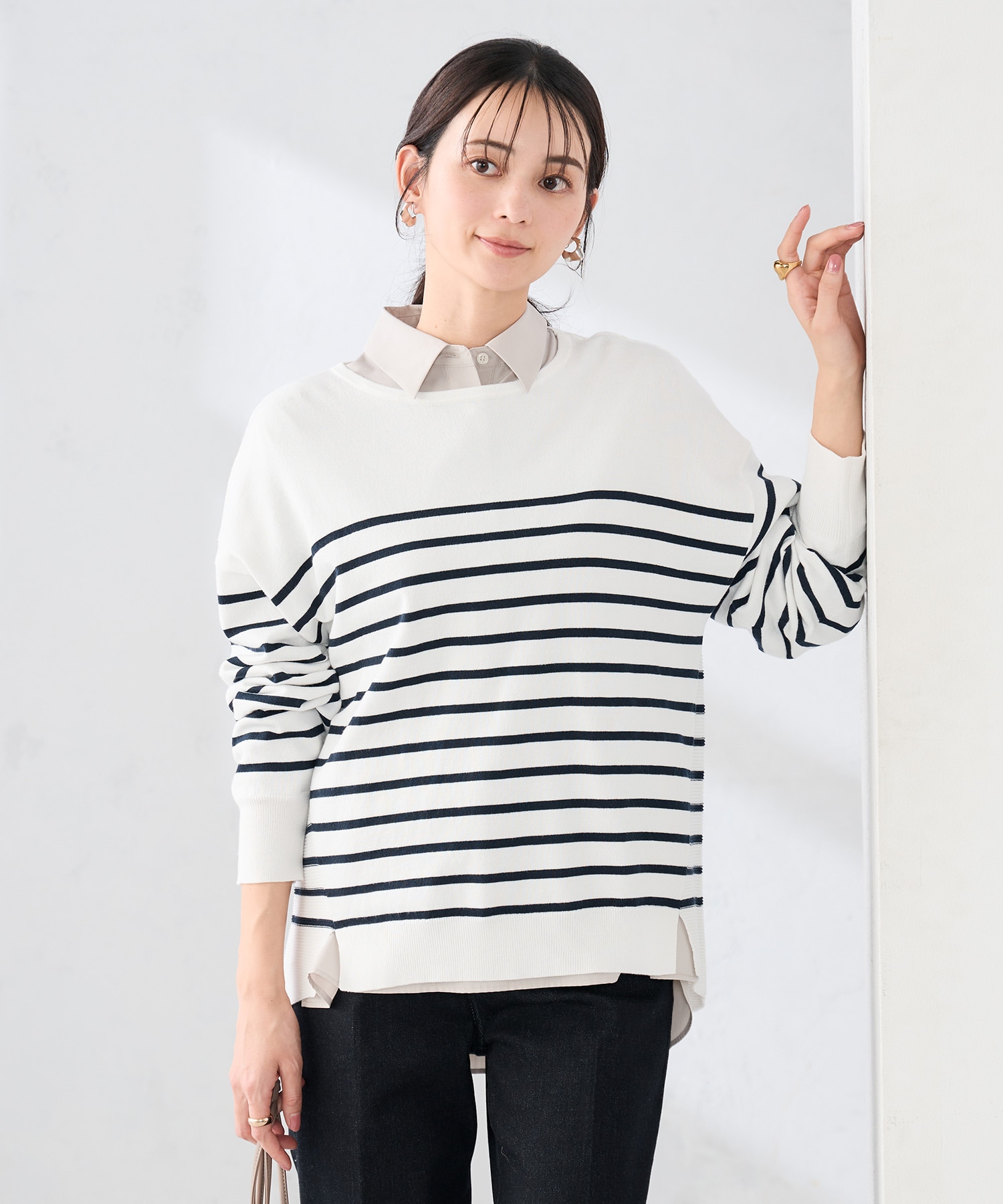 ニットやカーディガンの袖から裾を少し出して着ると抜け感のあるスタイリングに