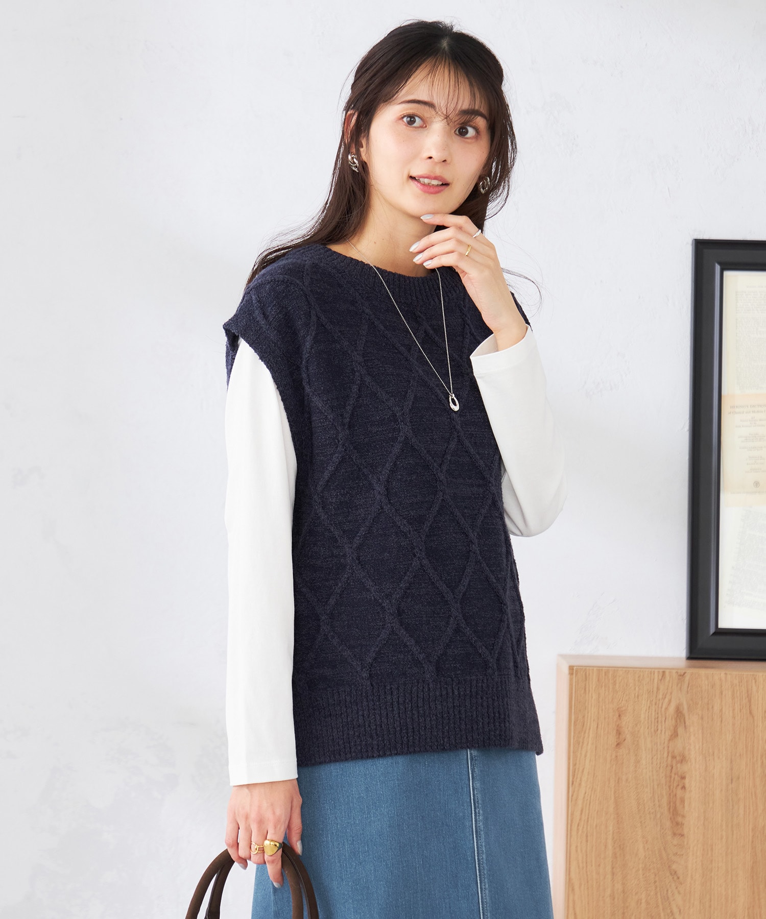 トレンドのニットベストを使ったコーデです。パンツスタイルにするとお仕事にも◎