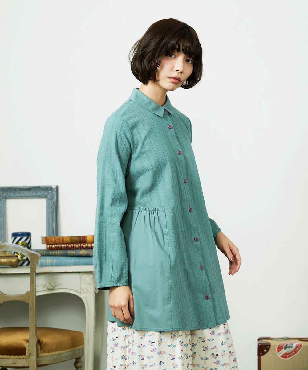 さらりとした肌触りのコットン100%素材。ローン生地とストライプ状に柄の入った同色のドビー生地をドッキングしたデザイン。サイドに切り替えのあるAラインシルエットです。ロング丈なので、気になる腰回りをさりげなくカバー。肩周りはセットインスリーブですっき見えし、身頃はゆったりとした着心地です。