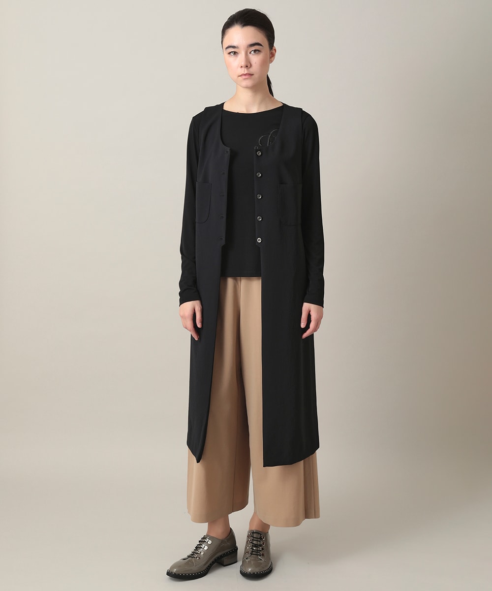シーズンレスで活躍するジレは縦のラインを強調するロング丈で着痩効果抜群です。薄手ですが落ち感があり程よいドレープ性があります。シンプルなデザインで、羽織るだけで全体を引き締めます。高い位置につけたボタンがスタイルアップを叶えます。薄手な服が多くなり、身体のラインが気になるこれからの季節に重宝するアイテムです。
