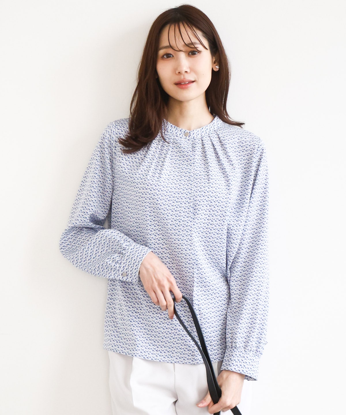 シーンを選ばず着回しできる幾何柄バンドカラーブラウス☆