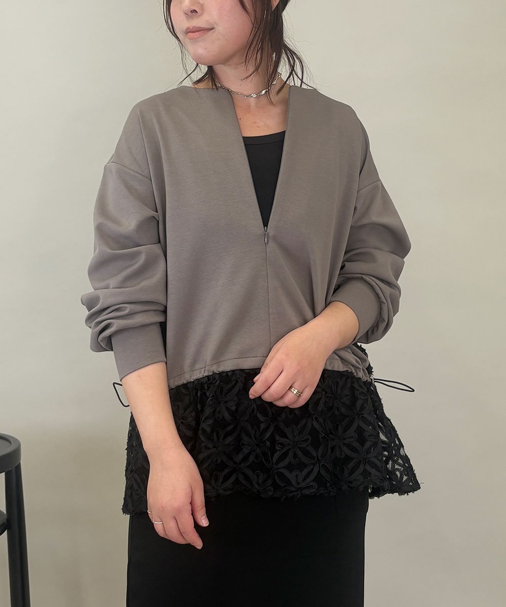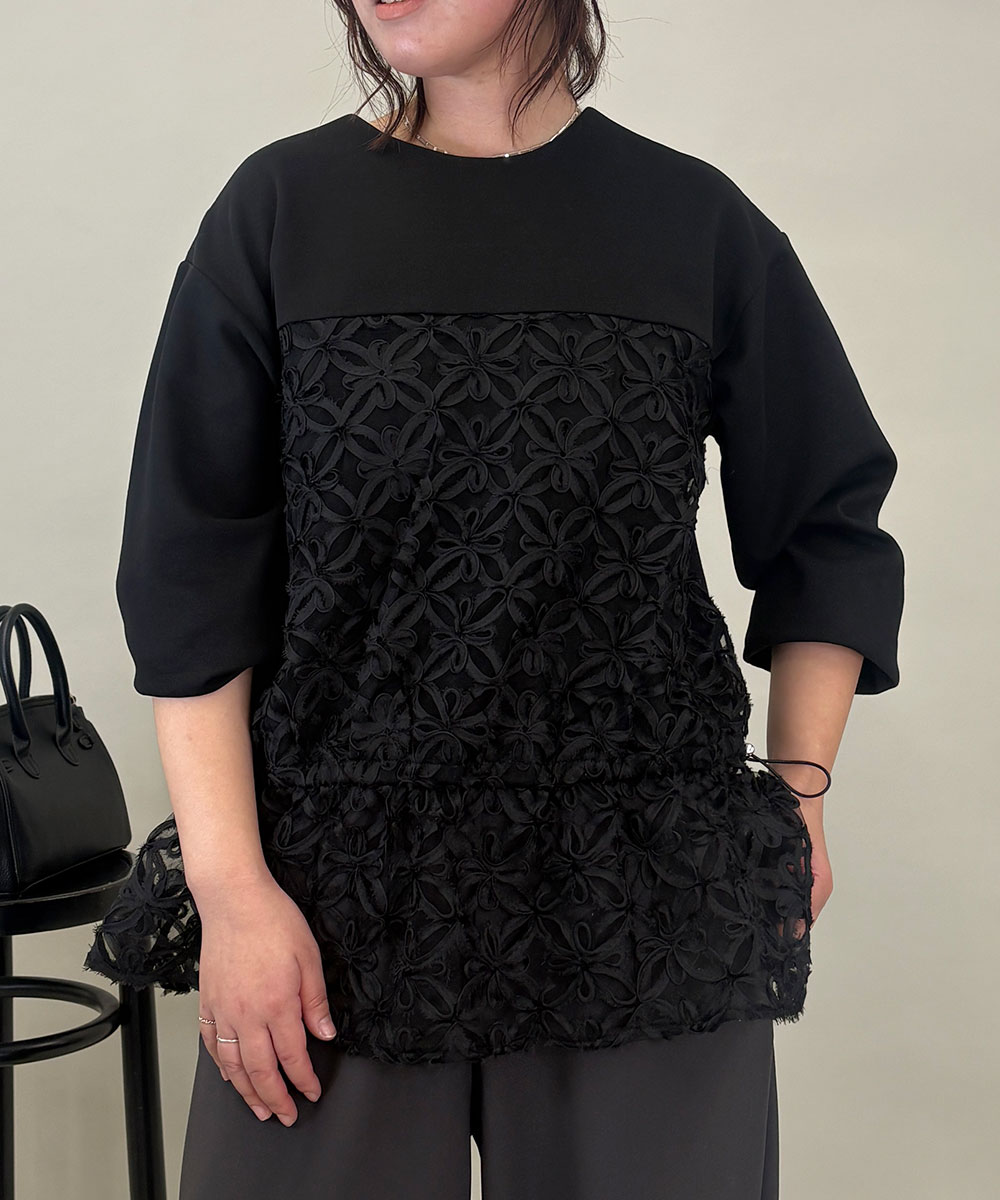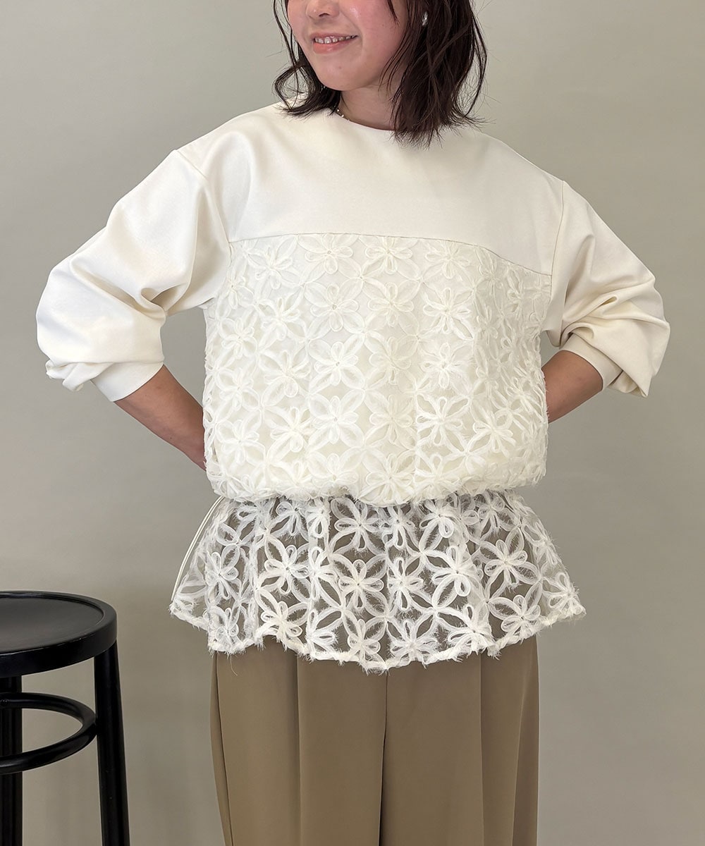ゆったりしたレースドッキングのトップスにタイトスカートが