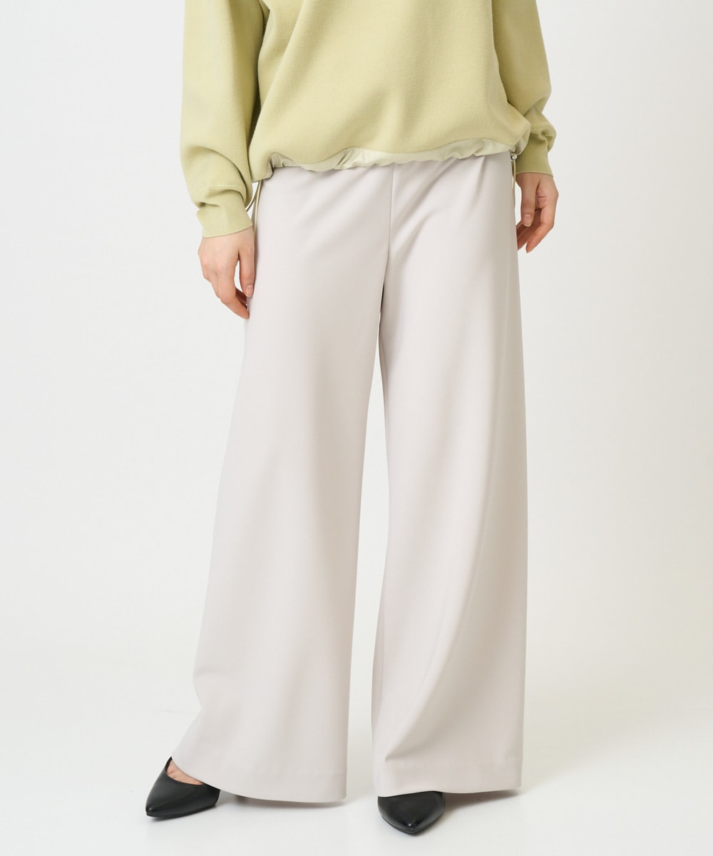 シームレスワイドパンツはウエストゴム仕様で楽ちんながら、バイヤス使いのデザインにより横幅を感じさせず、すっきりと美脚に見せてくれます。