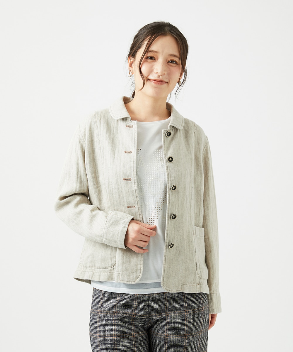 ジャケットは、ジャンニロらしいやや小さめの丸衿が上品さを演出し、柔らかく自然な風合いが肌になじみます。