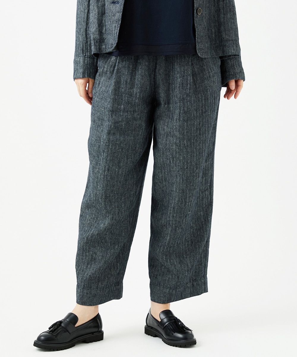 ナチュラルな風合いと、小さめな丸衿がジャンニロらしいジャケットと、ウエストゴム仕様のパンツは、下半身太めや150cm台後半の方にも自然にフィットし、オンオフ兼用の便利さと着回しの良さを備えています。