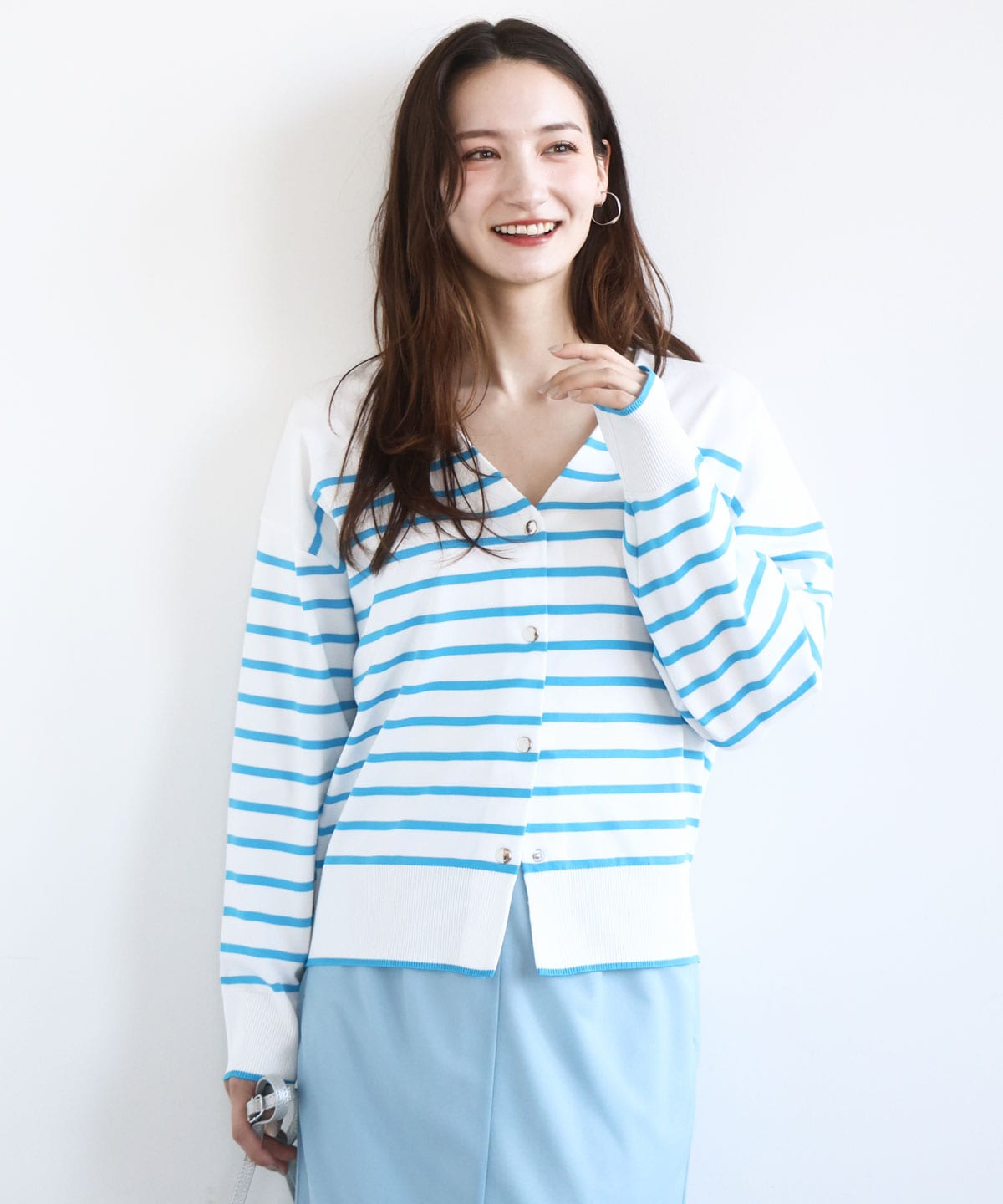 ドット釦Vネックカーディガン(無地・ボーダー)/洗える