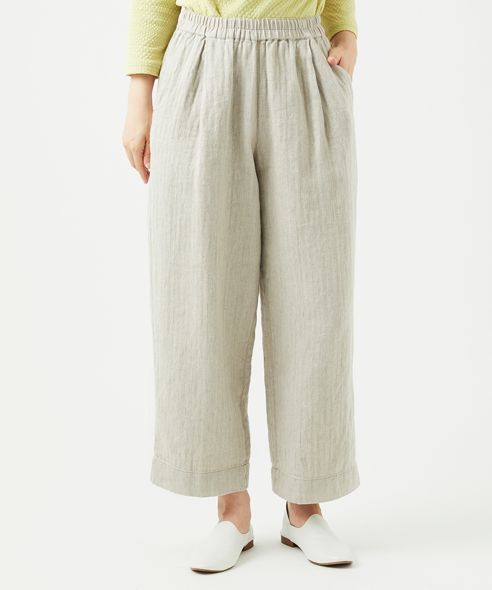 麻綿のワイドストレートパンツは、柔らかで、リラックス感のある履き心地です。