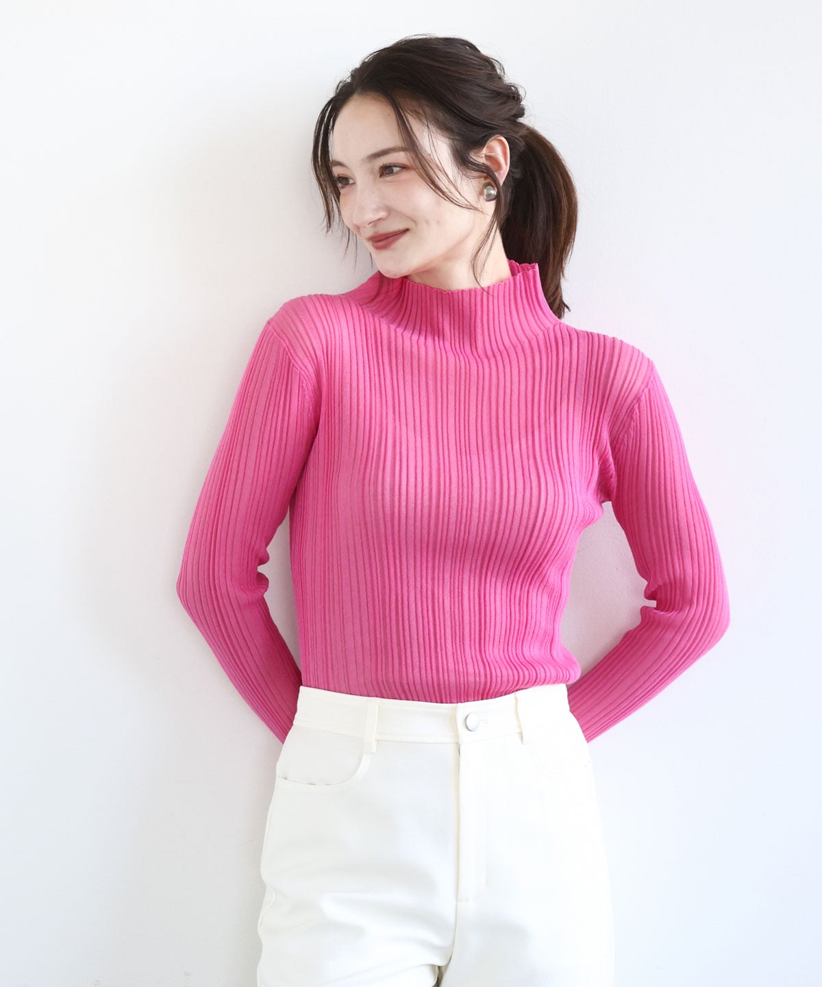 インナーには透け感のあるハイネックシアーリブニットを重ねて、今年らしいレイヤードスタイルに!