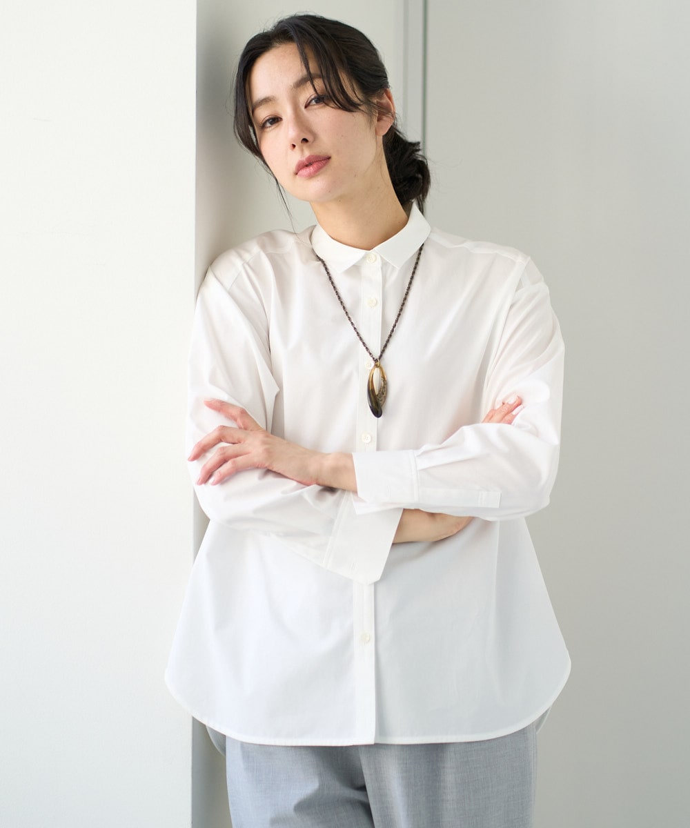 白いブラウスはシンプルながらも洗練されたデザインで、通勤や休日のどちらにも対応します。