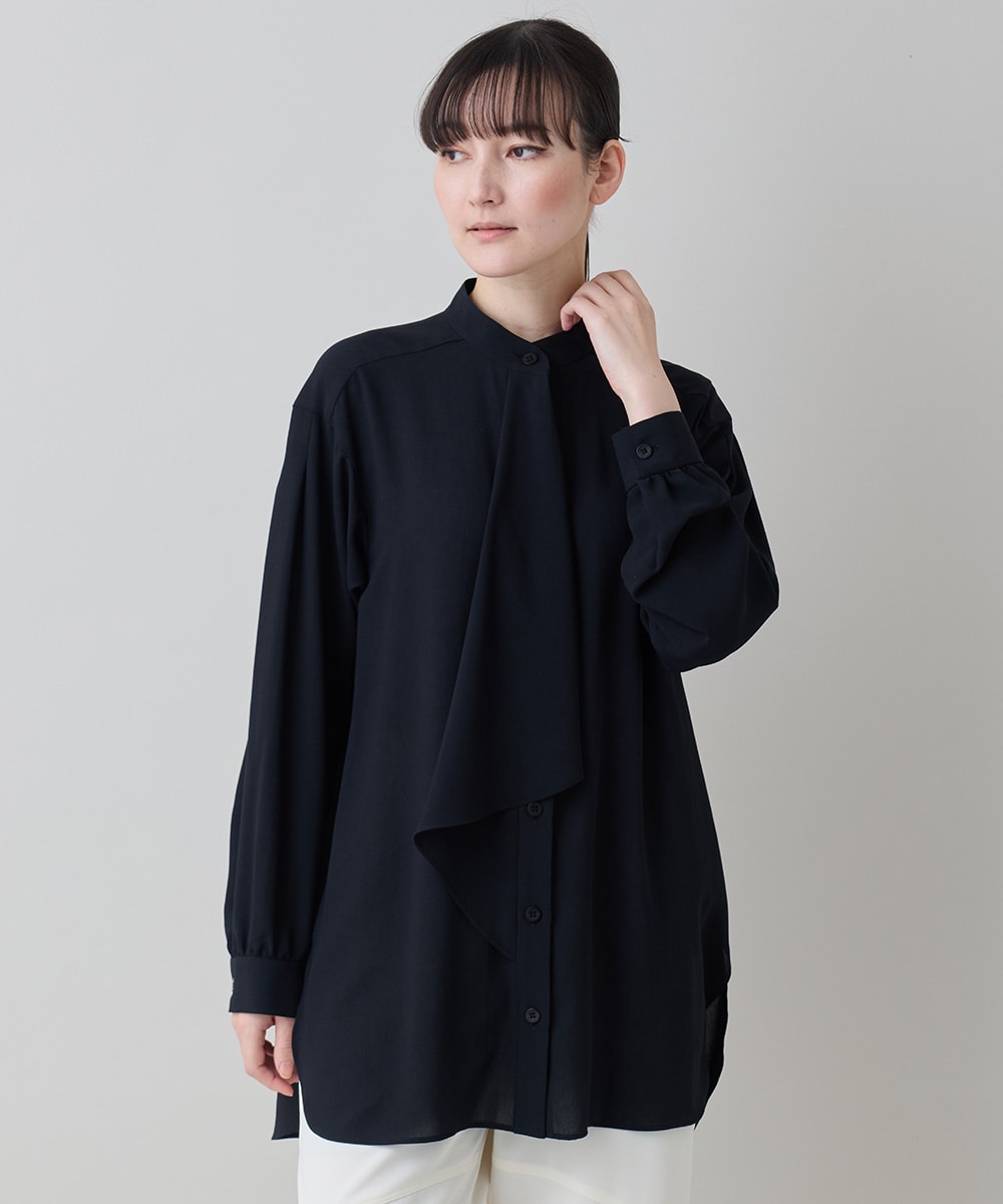 素材を活かし前合わせに付けたドレープデザインが、動くたびに揺れて表情が生まれます