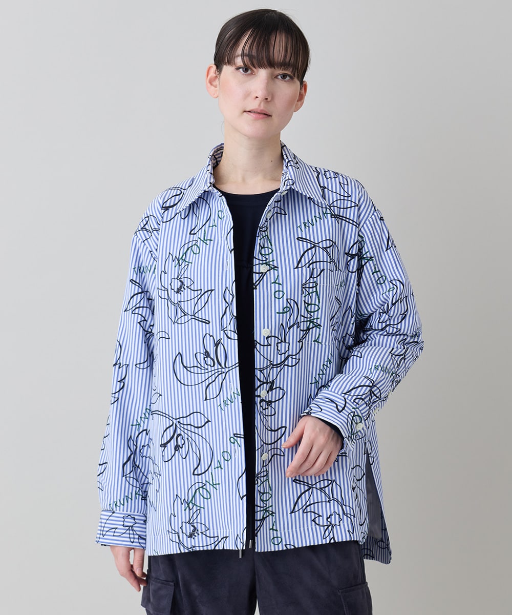 ストライプフラワーワイドシルエットシャツは、ニュアンスある線画プリントとふんわりとした質感がポイント。