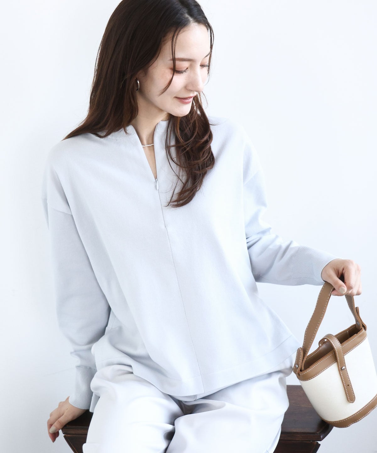 トレンド感のあるフロントファスナーデザインニットと合わせて、レイヤードスタイルも楽しめます。