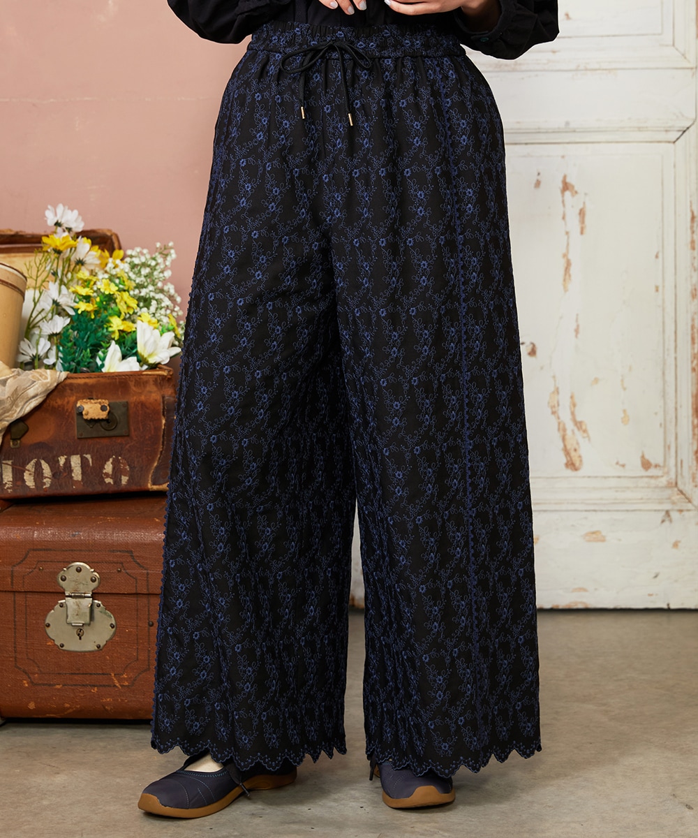 繊細な花柄の総刺繍を全面に施した贅沢なワイドパンツは、ほどよいフレアシルエットで体のラインを自然にカバー。ウエストはオールゴム仕様、紐も通してあるのでサイズ感の調節も可能です。裾のスカラップや切り替え線に施したレースがアクセント。柔らかなポリエステルツイル素材をベースに、繊細な花柄を総刺繍で表現した華やかな素材。