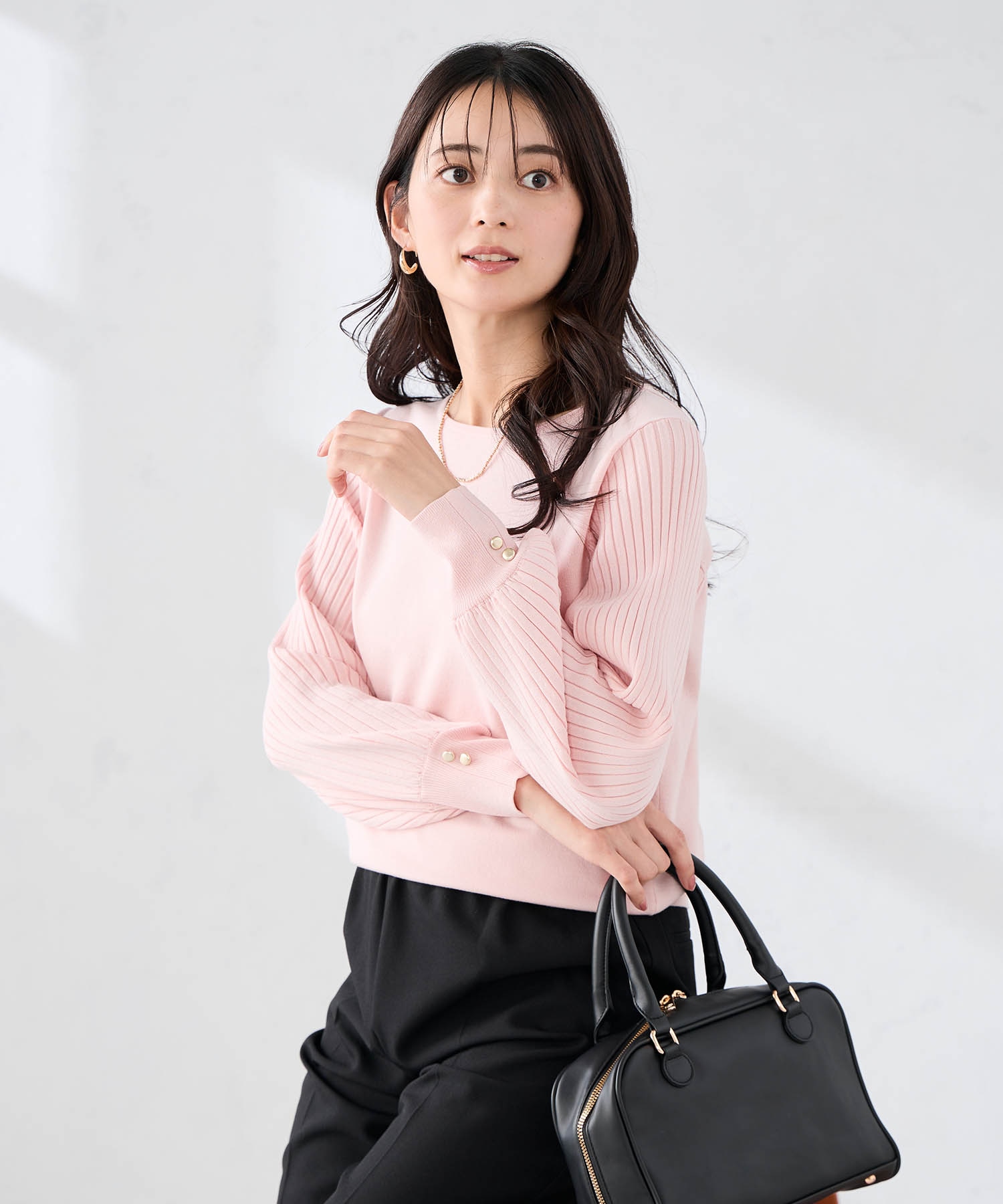 ふわっとしたプリーツ袖と飾りボタンが女性らしい、華やかなキレイめニットです!