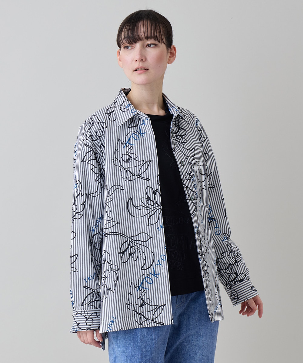 ストライプフラワーワイドシルエットのシャツは、ニュアンスある線画プリントと