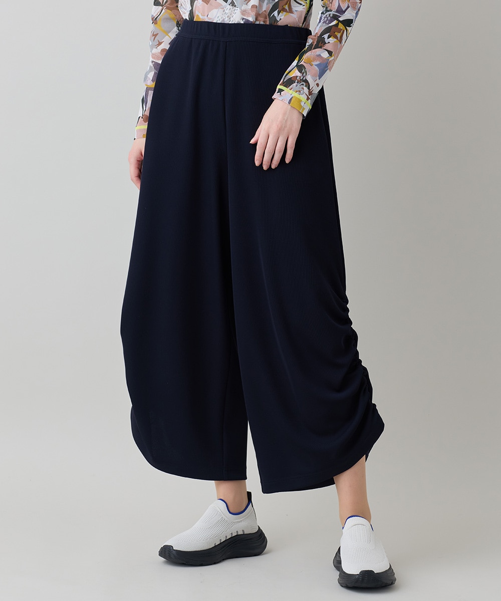 ドロストギャザーリブニットワイドパンツは、しなやかなリブ素材が