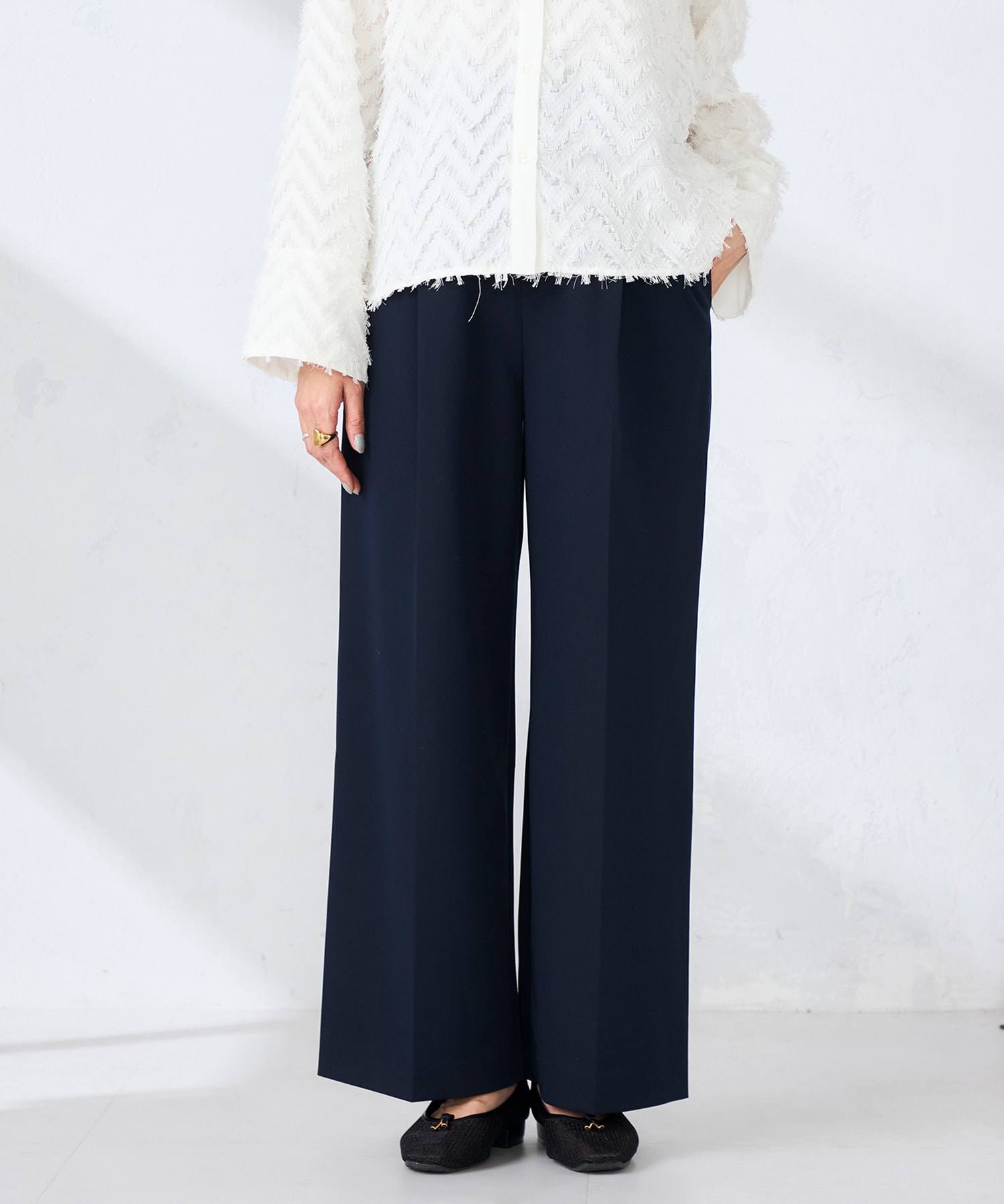 ニットはシンプルながらもデコルテを美しく見せる絶妙な首元が魅力◎