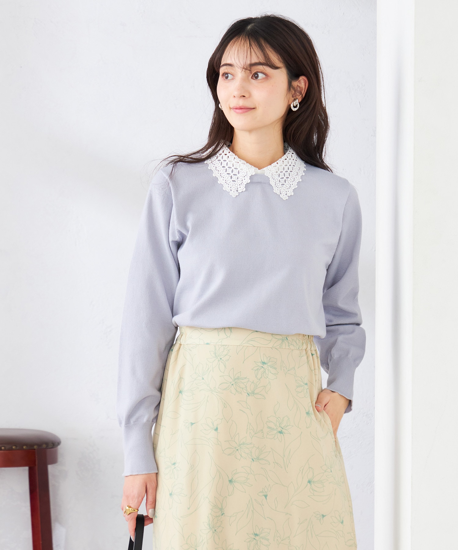 トップスは繊細なレース衿がポイントで、取り外し可能の2WAY仕様できれいめからカジュアルまで幅広く着こなせます。