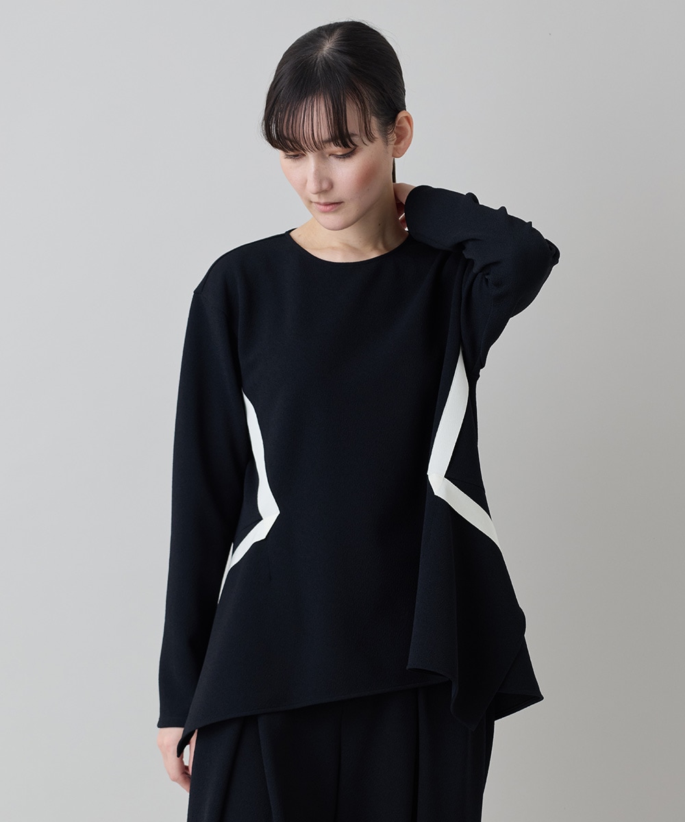 日本製のジャージー素材でソフトな質感と立体感のあるヘムラインがエレガントな印象をプラス.
