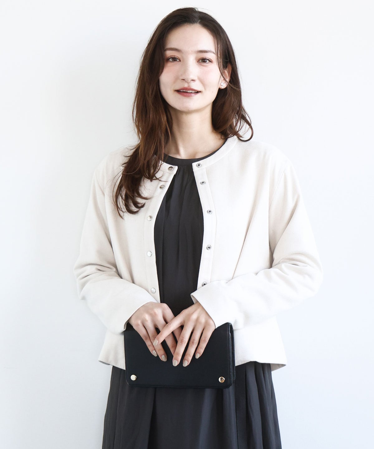 カーディガン感覚で軽く羽織りやすいショートジャケット。薄手のフェイクスウェードで伸縮性があり着心地の良い素材です。裏地付きで袖を通したときにさっと羽織りやすさを感じることができました。普段使いからお仕事、きれいめシーンにまで幅広く活躍してくれます。