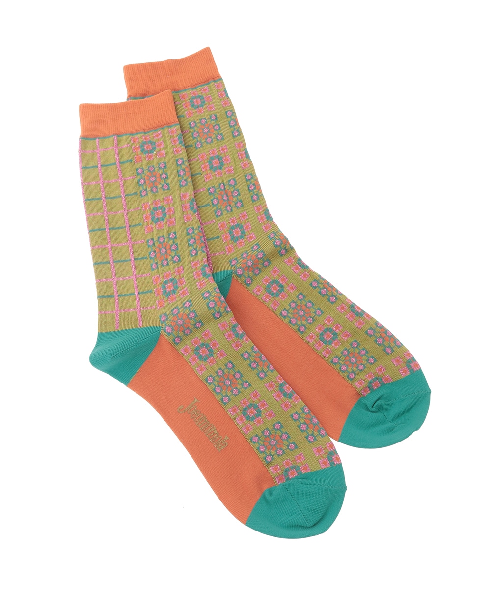 幾何柄×チェック柄を組み合わせたジャカードソックス。身に着けるだけで気分が上がる春夏スタイルのアクセントにオススメの一足です。