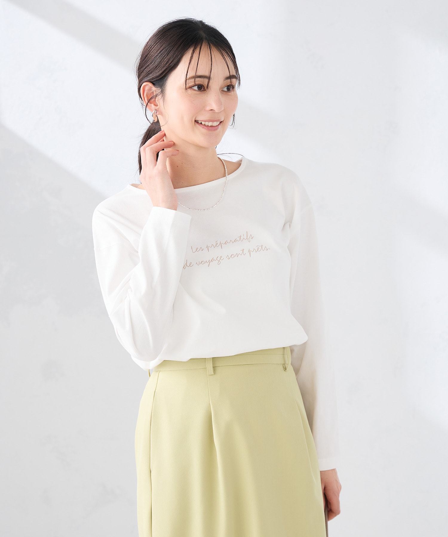 Tシャツは、カジュアルになりすぎないロゴデザインで着やすく、着丈や裾の形状をアップデートし、1枚でもインナーとしても使いやすいです。