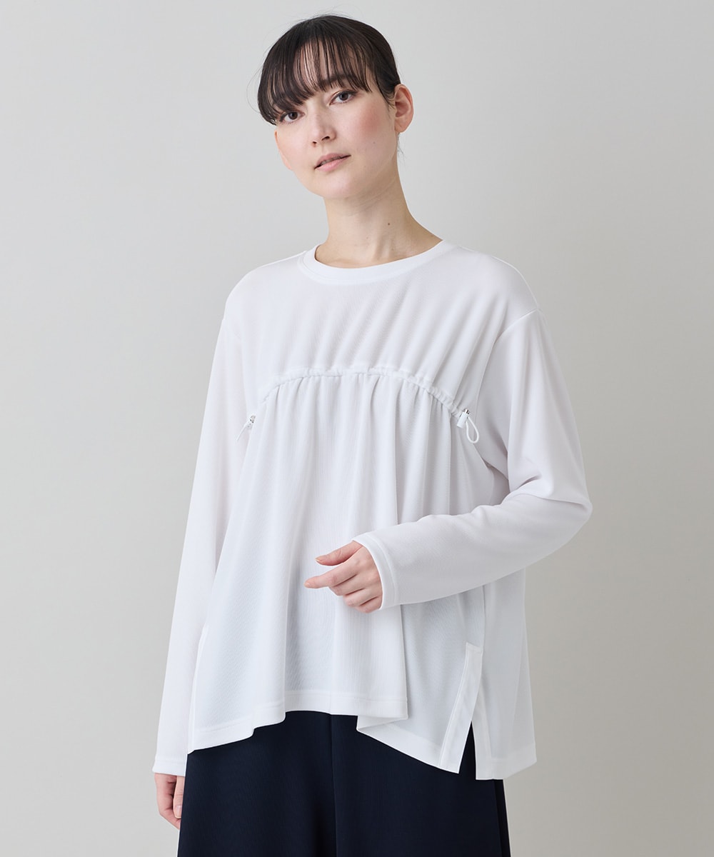 伸縮性のあるリブ素材で体のラインが目立たなく、動きやすさと快適な着心地を両立しています。ドロスト(引き紐)により、その日の気分でシルエットの変化を楽しめるのが魅力です。