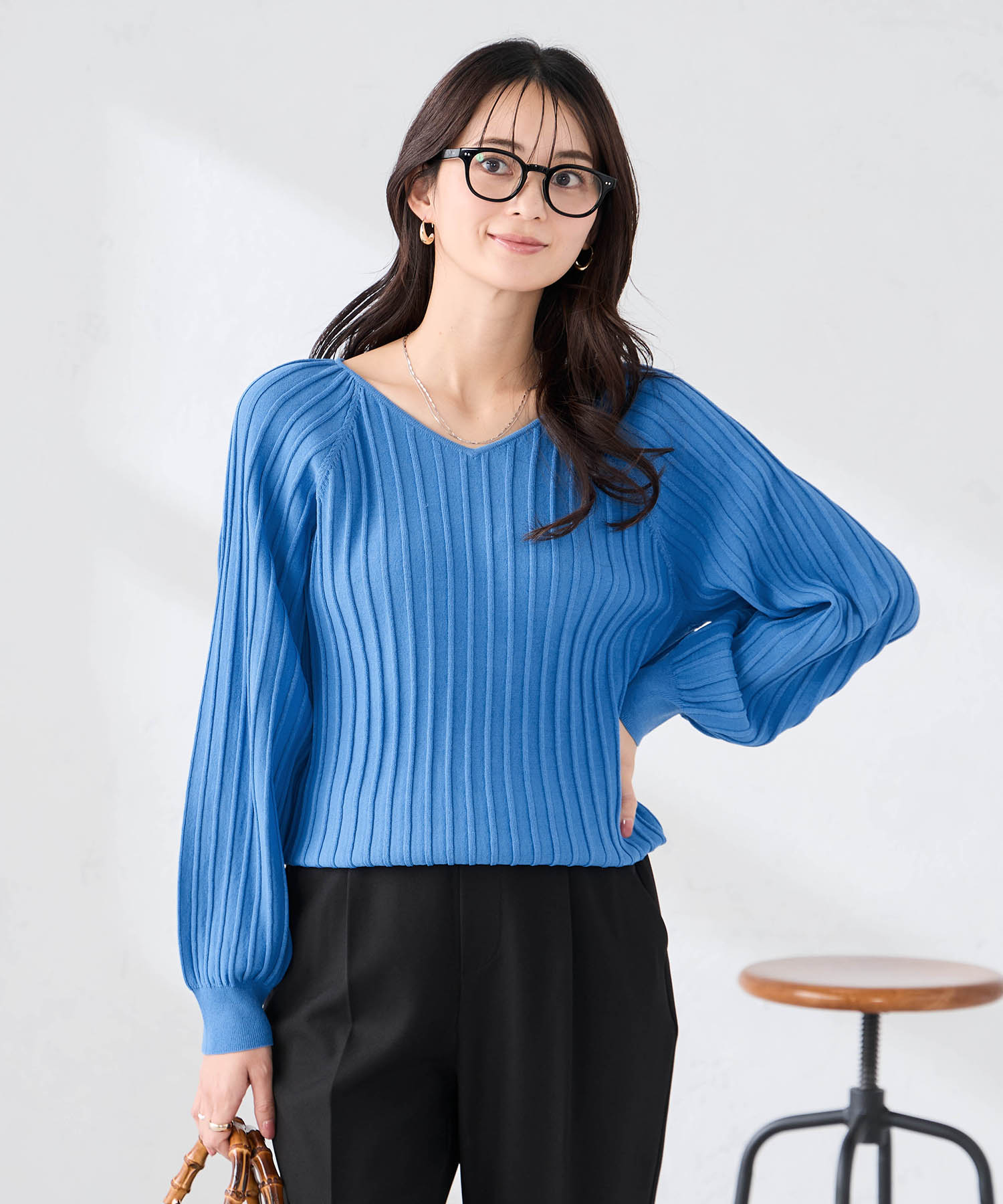 キレイなブルー、女性らしいシルエットが素敵なニットです。