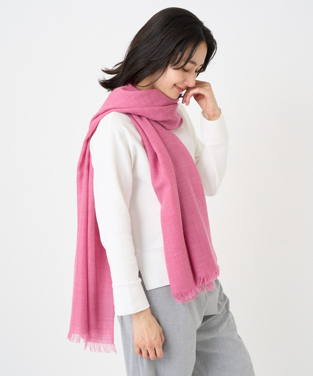 ピンクのニットとストールは、柔らかくメランジ調の優しい色合いが顔映りを華やかに演出し、春の装いにぴったり‼︎