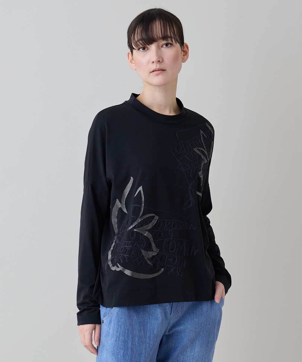 ワンカラーに落とし込んだダイナミックなコラージュアクセントが魅力的で、グリッターとステッチ刺繍がお上品で気合わせしやすい一枚です。