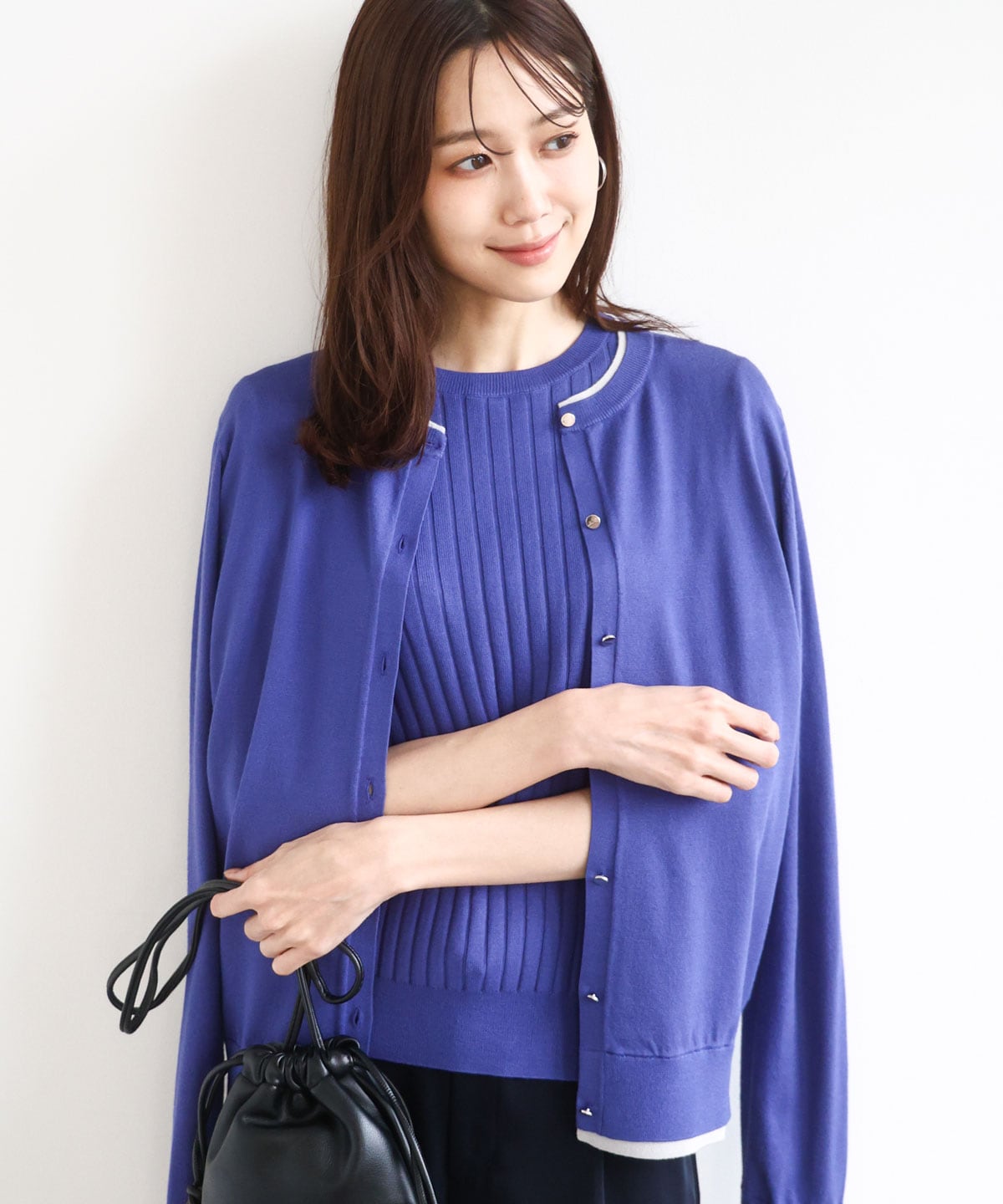 カーディガンの配色ラインがアクセントに。