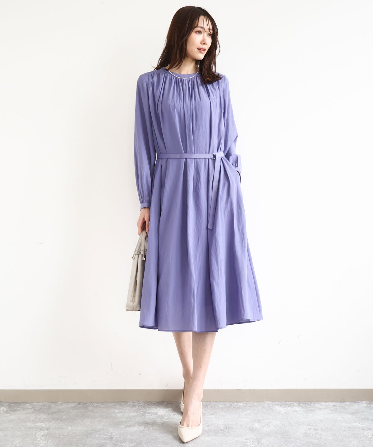 上品な光沢と柔らかなサテン素材を使用したギャザーワンピースは、ネックと肩に施された細やかなギャザーが歩くたびに優雅に揺れるドレープ感を演出し、洗練された印象を与えます。