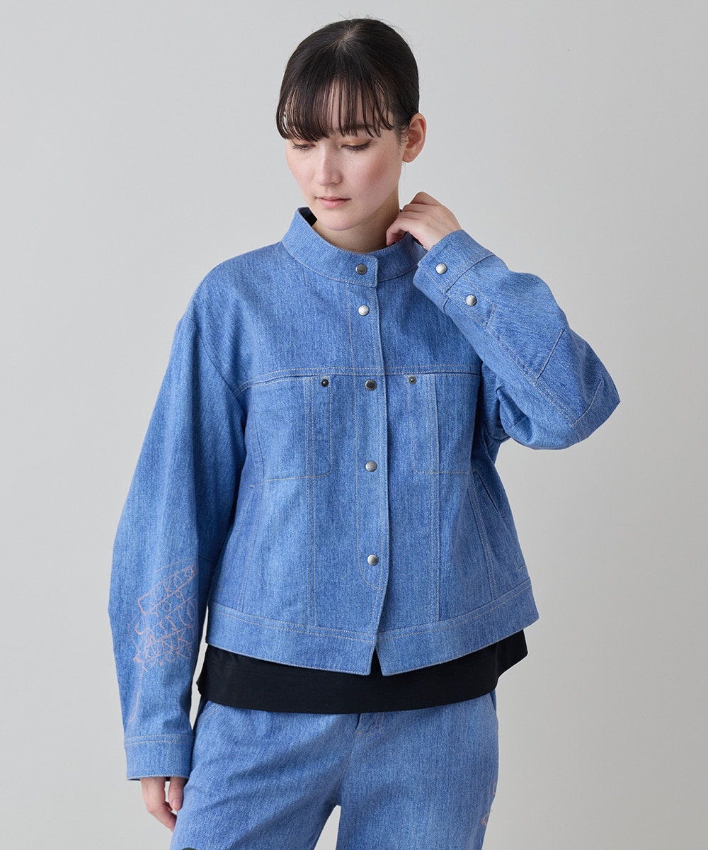 春らしいブルーデニムカラーが日差しに映えるジャケット