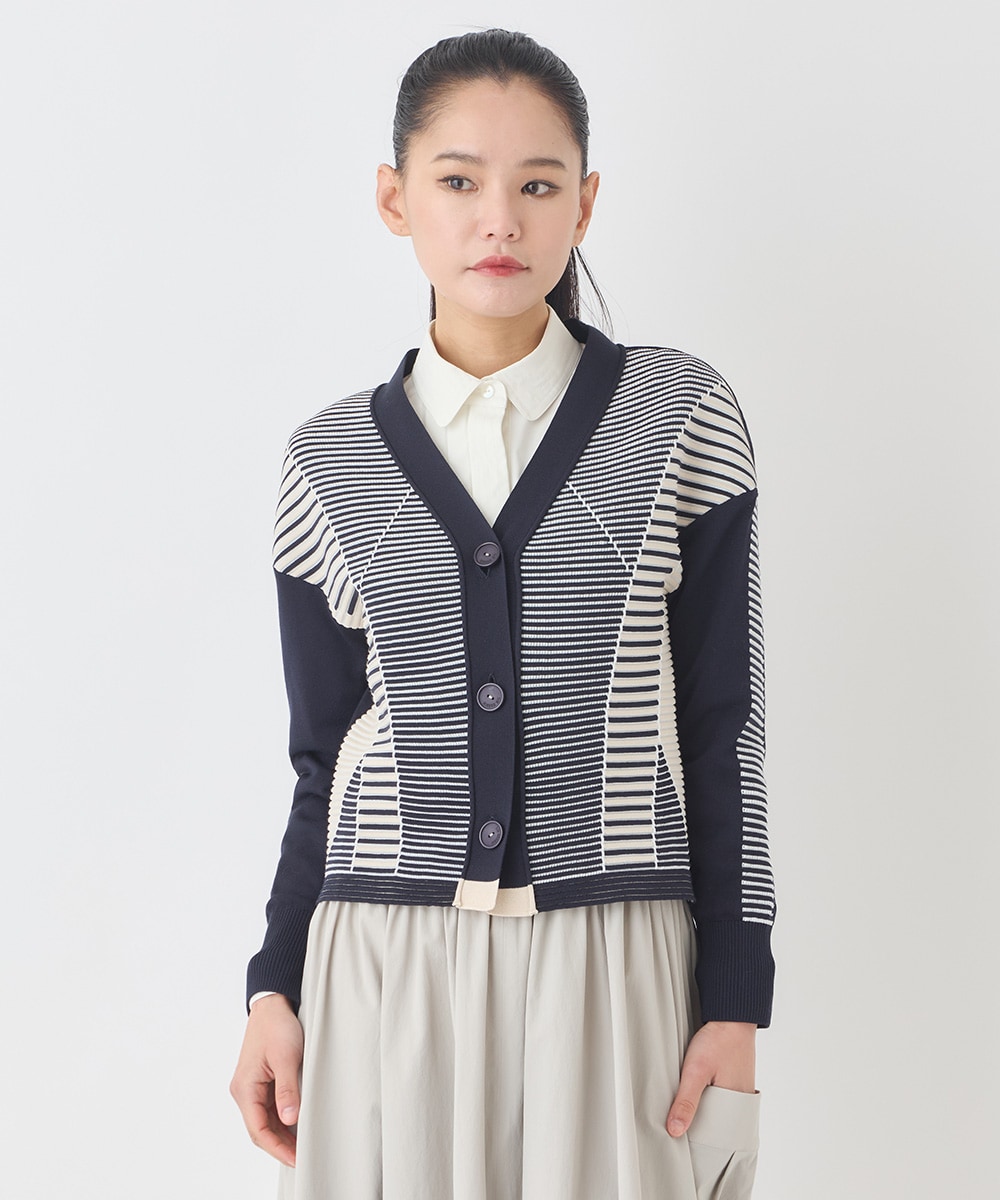 ボーダーミックスニットカーディガンとプルオーバーは、異なる編み地を巧みに組み合わせた立体的なデザインがポイント。
