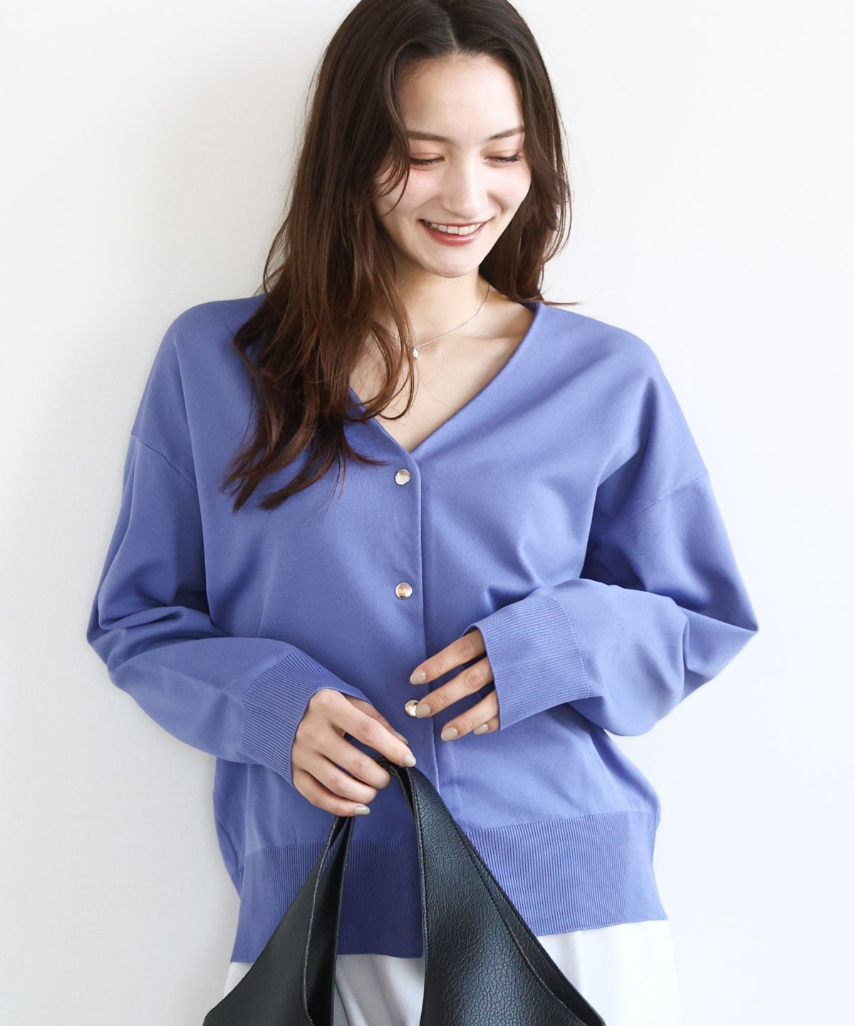女性らしいVネックラインとシルバーの釦でカジュアルにもきれいめにもコーディネートしやすいニットカーディガン。