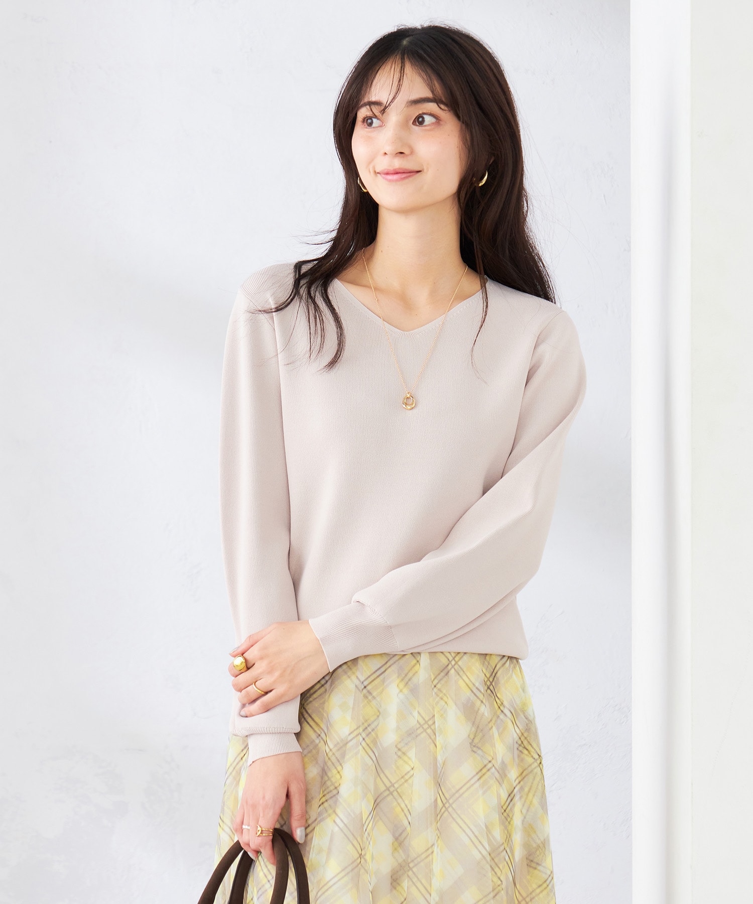 インナーのニットとスカートをグレージュで統一して