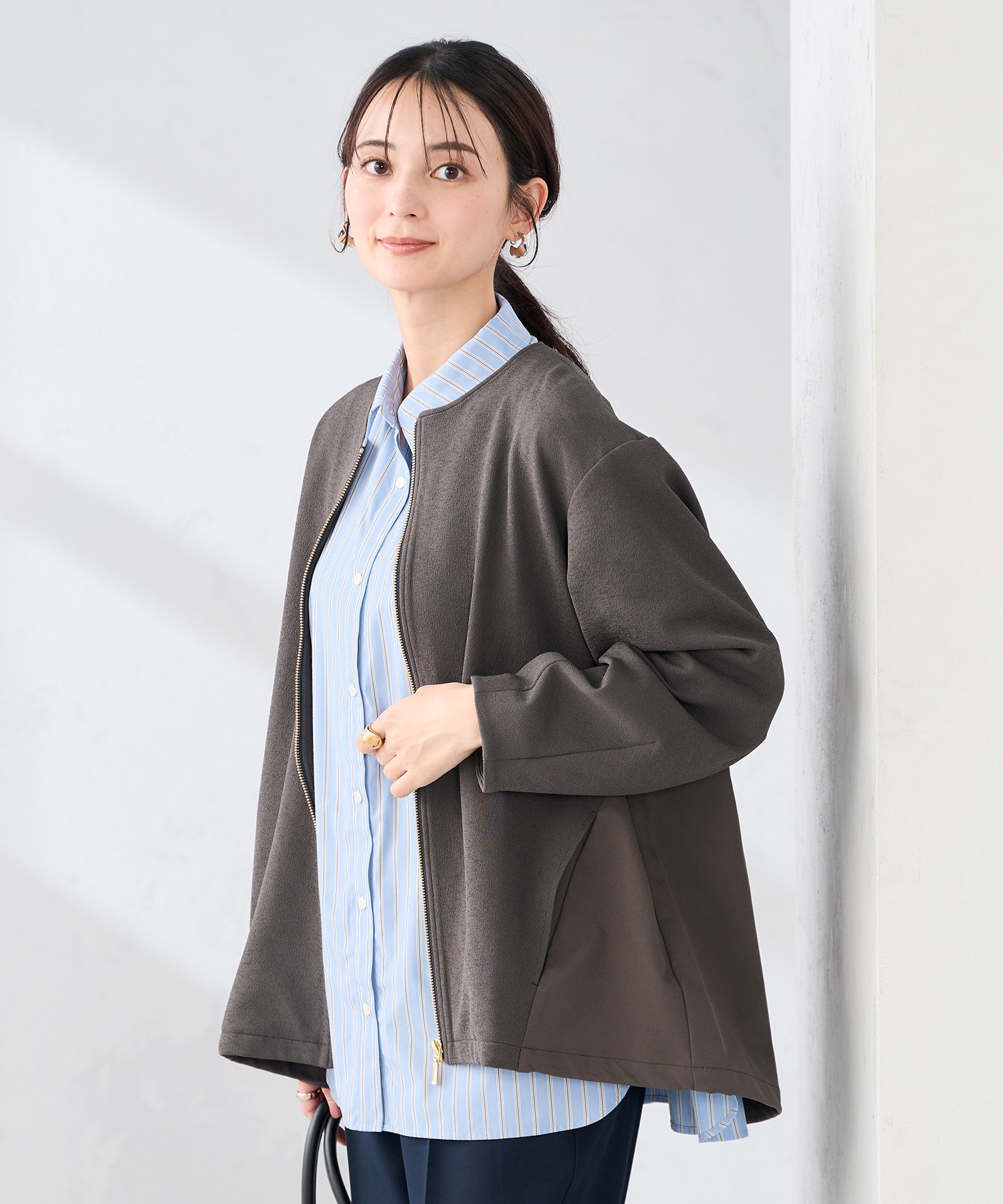 シンプルで、サッと羽織れるライトアウターのコーディネートです。