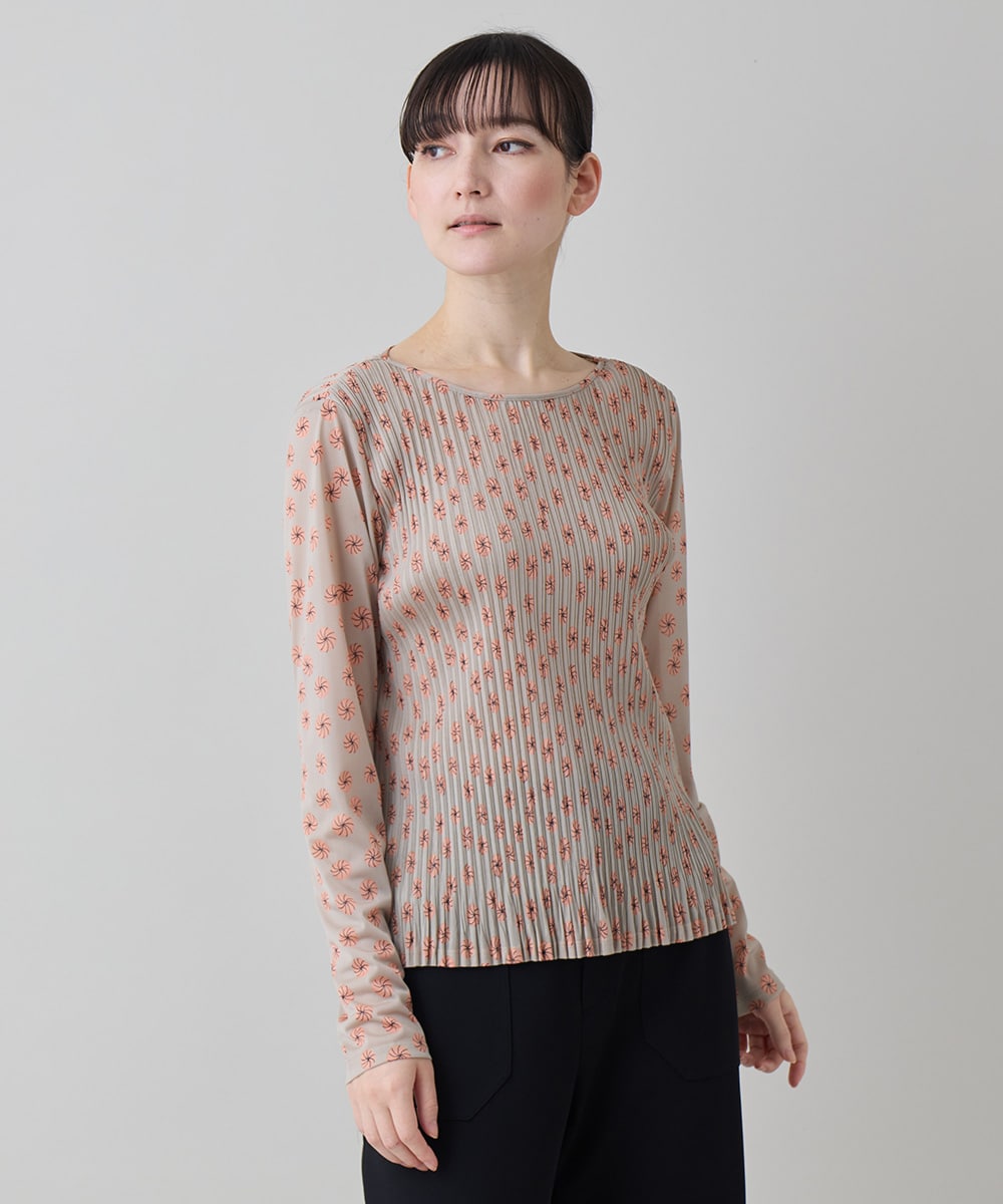 インナーにはオリジナル柄が個性的で春らしい、プリーツ加工を施したトップスを