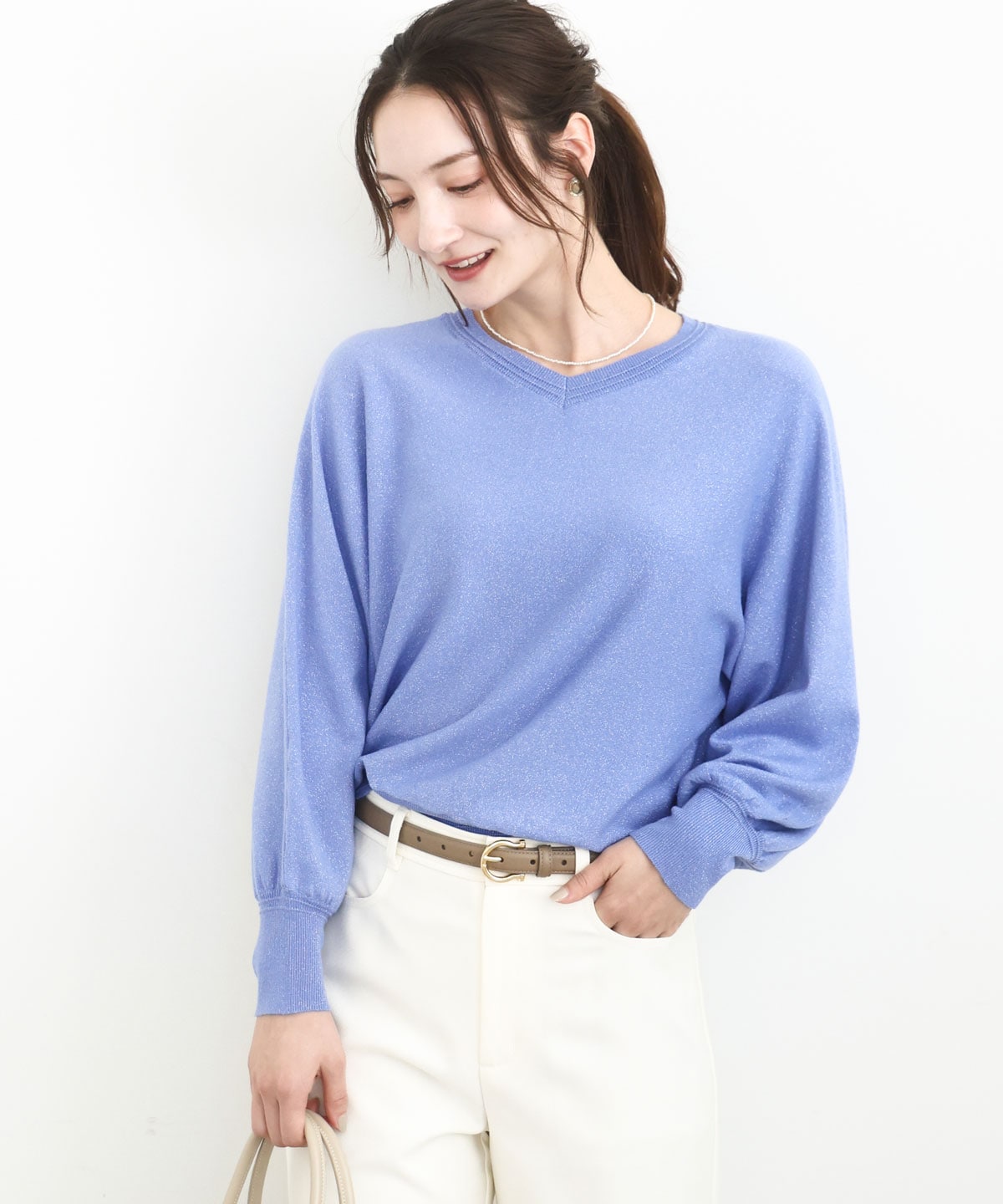 前後2way仕様のラメドルマンニットは、繊細なラメが女性らしさを引き立て、ストレスフリーな着心地も魅力。