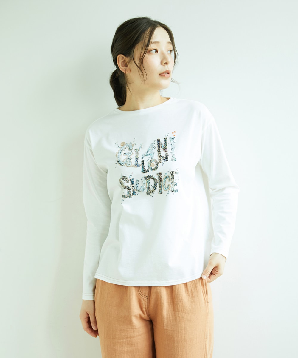 洗える・日本製の[洗える・日本製]ハイゲージ天竺ロゴカットソーは、華やぎロゴデザインとスパンコール刺繍がアクセント。