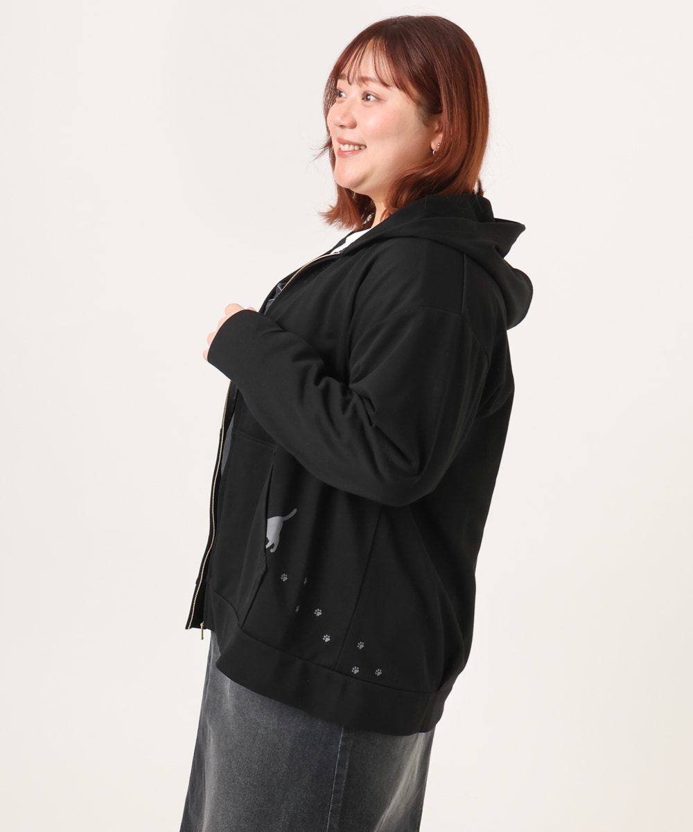 足跡とポケットに入り込む猫のプリントがさりげなく可愛い、大人のためのねこプリントパーカー。