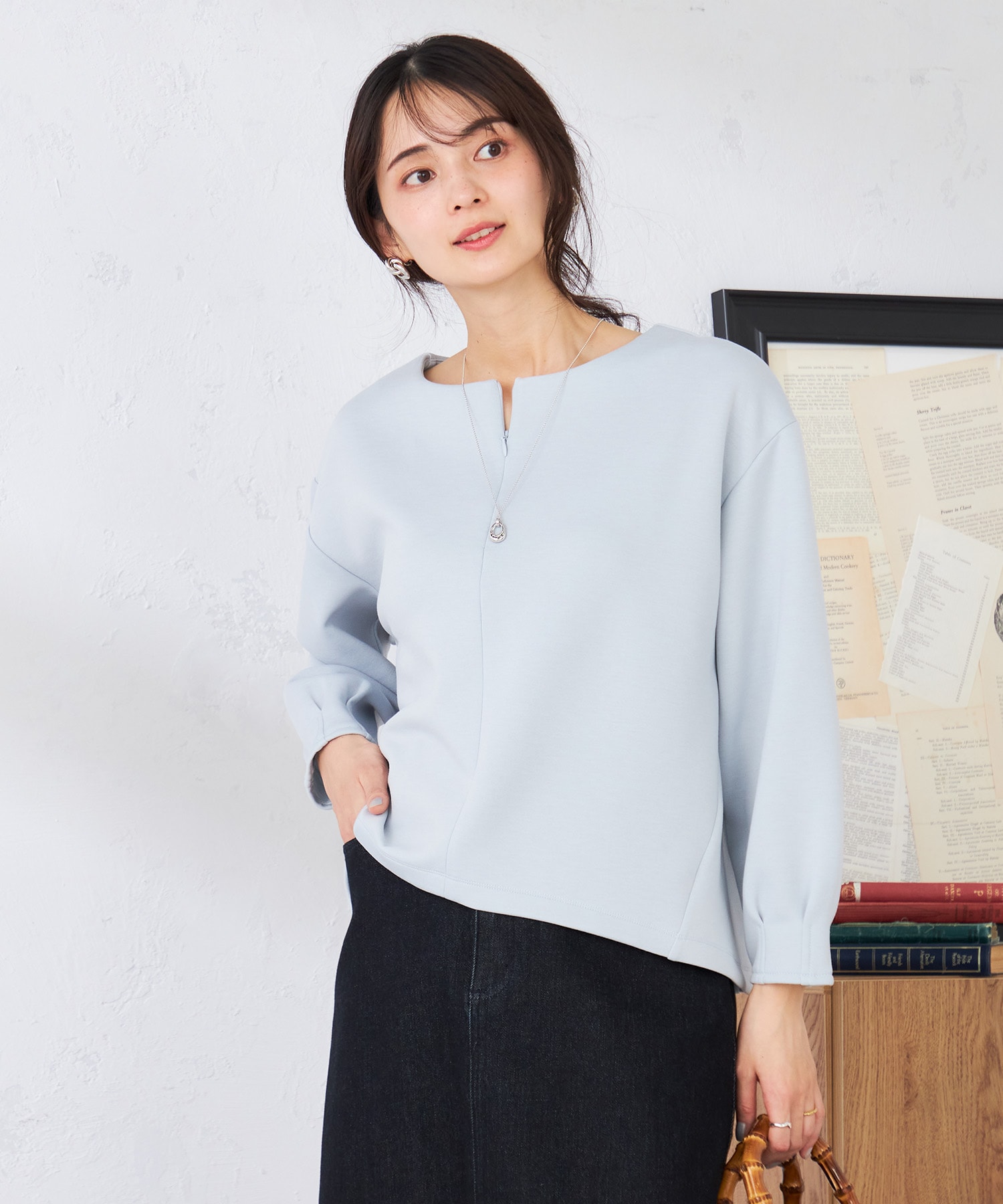 トップスは、程良いゆったりシルエットで着やすく、インしなくても決まる丈感が嬉しいポイントです。後ろはタックが入っており、スッキリとした印象で着ていただけます。