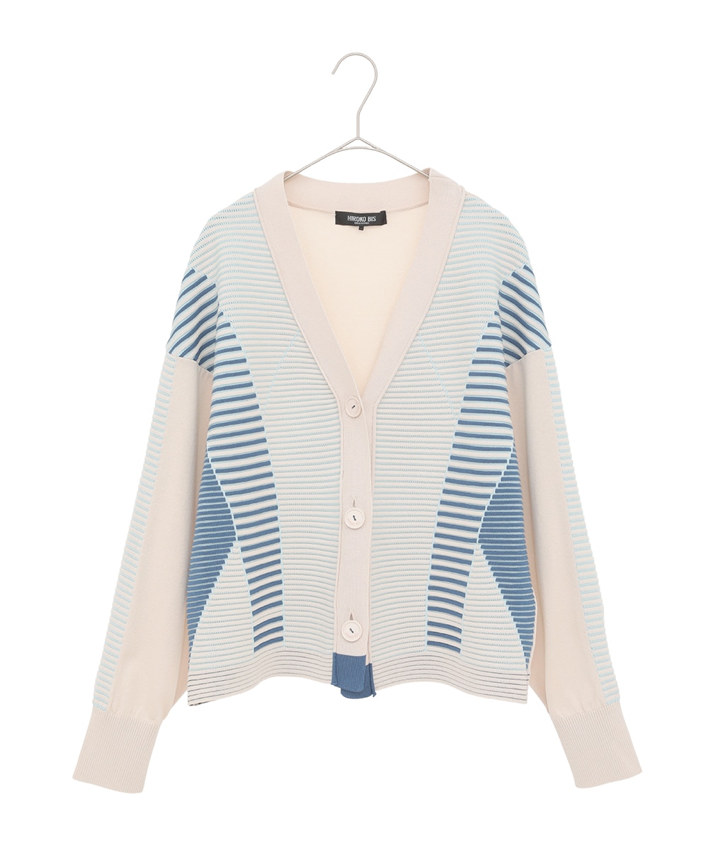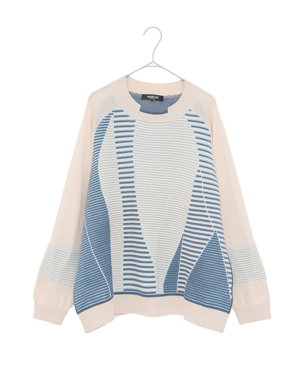 ニットは異なる編み地を切り替えた立体的な表情が魅力で、首元をすっきり見せるデザイン。