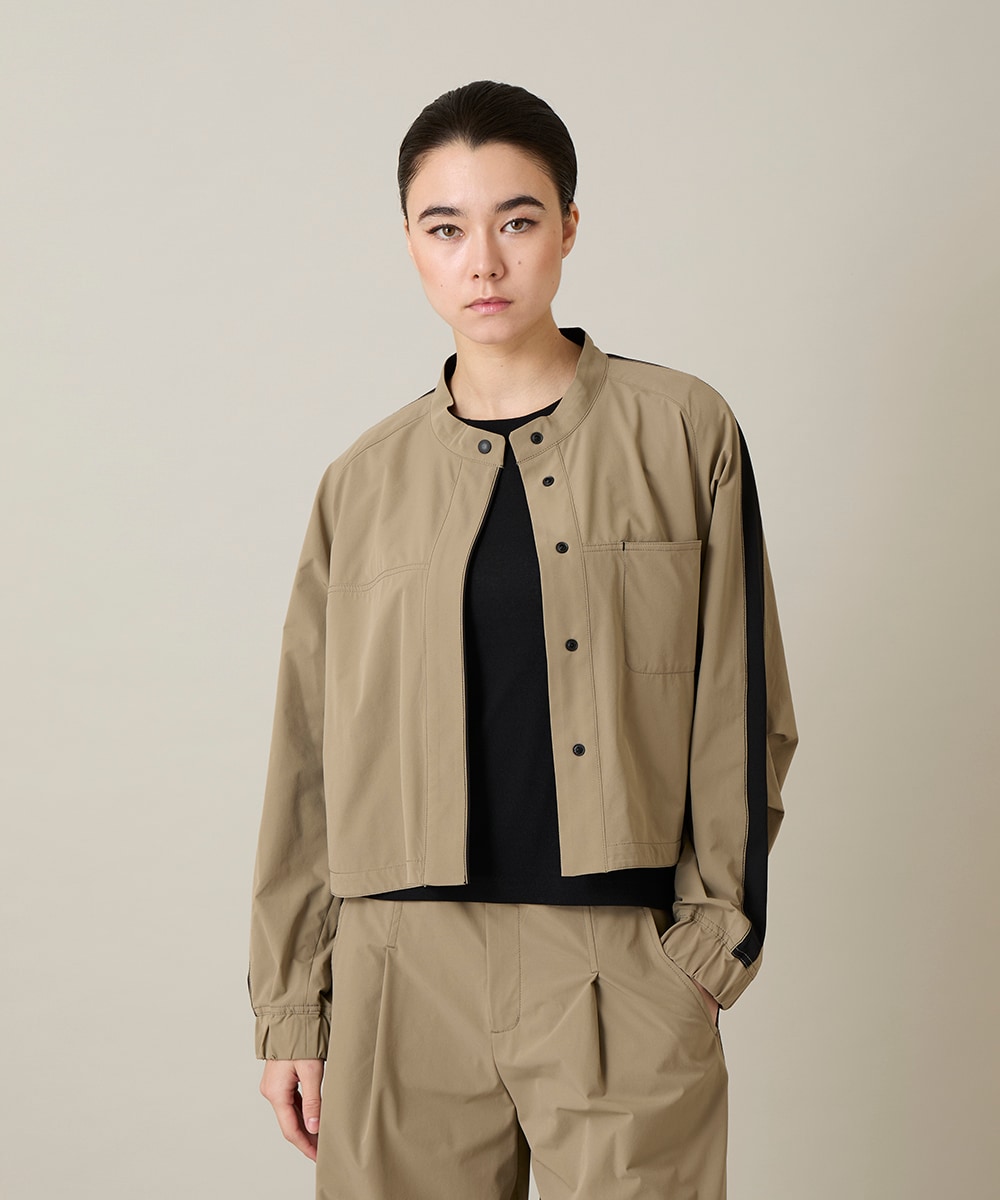 ライトな羽織りジャケットは超軽量タフタ素材で軽さと通気性を感じるソフトなコットンライクな質感と皺になり難さが魅力。インナー次第で秋春夏と3シーズン活躍する素材です。また洗えてすぐ乾くので真夏も快適に着ていただけます。軽いのでストレスフリーさが人気素材です。トレンドのボリュームスリーブに入ったブラックラインがアクセントでブラックを合わせるとスタイリッシュシック。カラーコーデだとカジュアル感が更に増してスタイリングのイメージが広がります。