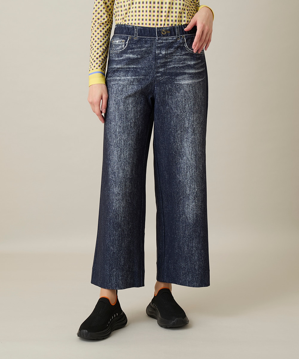 パンツは定番3Dデニムプリントの新型。従来のワイドより裾幅が少し広がりスラッと見えするシルエットにかわりました。サイドに濃色の影がついており、前から見ると視覚効果で着痩せして見えるのもgood。