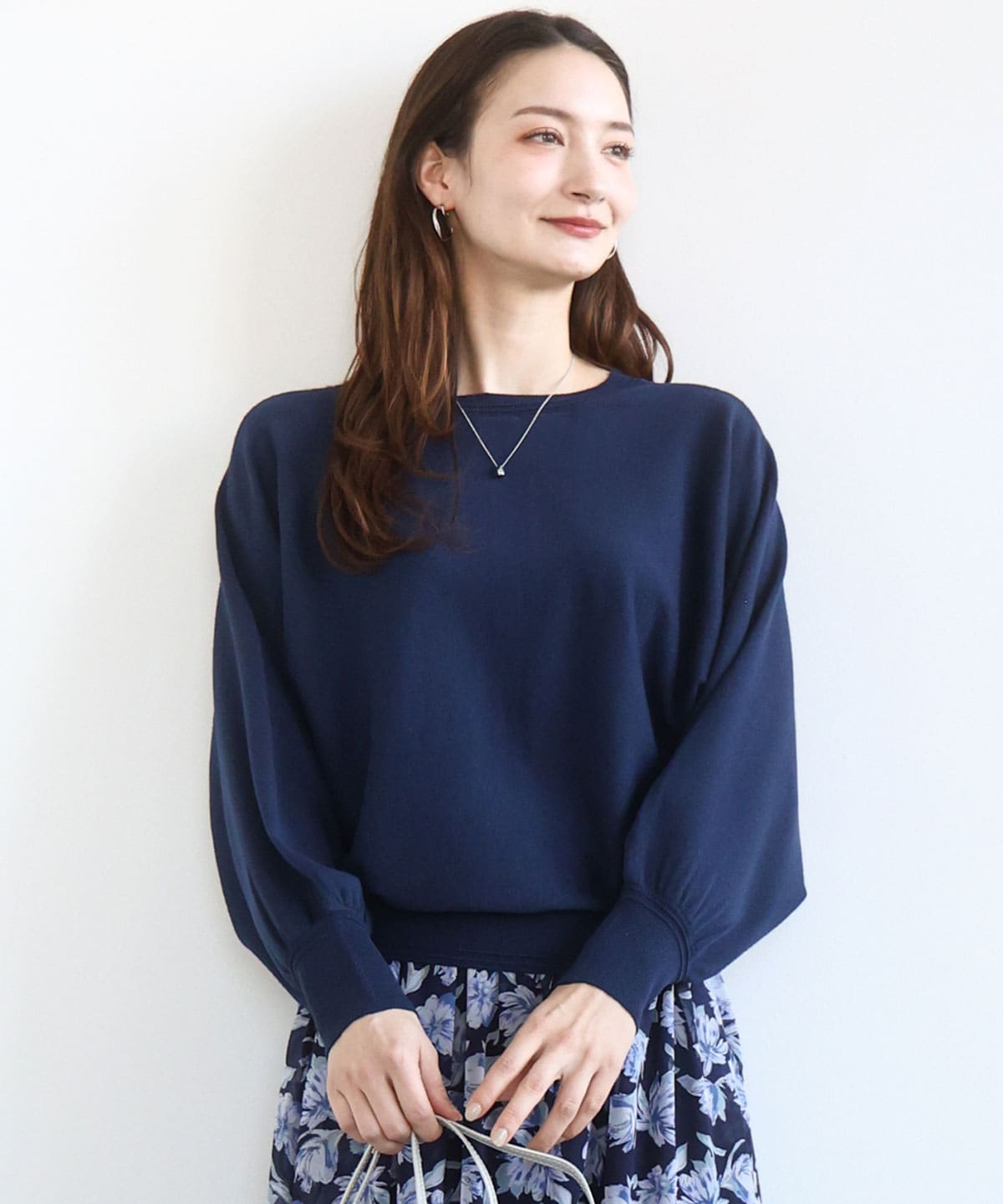 細かなラメ感がほどよく華やかな、さらりと軽い質感のドルマンニットです。素材感は、柔らかな触り心地の厚手すぎない中肉素材。表面は起毛感少なめなので、季節の変わり目にロングシーズンで着られそうです。サイズ感はゆったりめで、身体のラインを拾わずストレスフリーの着心地でした。丸襟となだらかなV字の前後2way仕様になっており、雰囲気を変えた着こなしが楽しめるおすすめアイテムです。