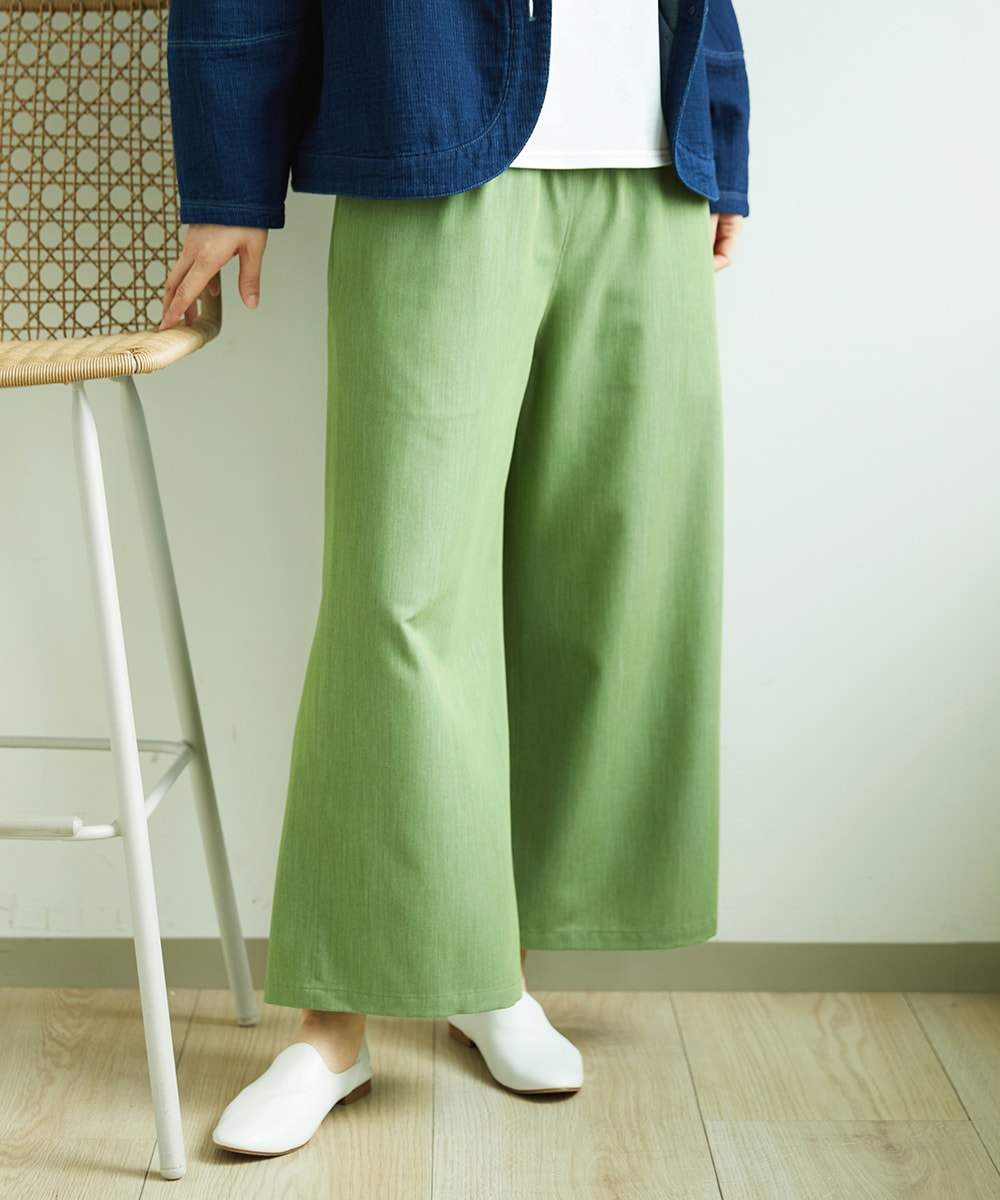 ウエストゴムの大人かわいいワイドストレートパンツは、異素材切り替えでウエスト周りもすっきり見せ、着用のストレスフリーさも魅力。
